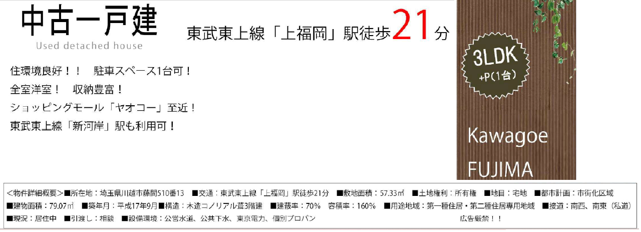 ☆川越市藤間 中古戸建て ☆東武東上線『上福岡駅』21分! ☆敷地面積17坪! ☆平成17年9月築、3LDK中古住宅です! ☆南西×南東道路の角地! ☆家事動線の良い対面キッチン付きのリビング! ☆収納多く荷物が片付きます! ☆川越立高階西小学校、高階西中学校の通学区です ☆公営水道、本下水、個別プロパンガス ☆ヤオコー(約190m)、セブンイレブン(約210m)、コープ共済(約600m) |
