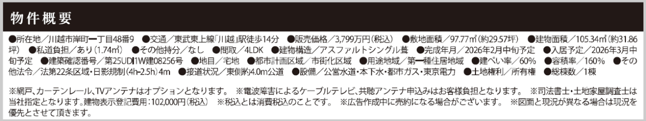 ☆川越市岸町4期 新築一戸建て! ★新築仲介手数料0円無料! ☆東武東上線『川越駅』徒歩14分! ☆土地面積29坪! ☆周辺にはスーパーやコンビニ、小中学校も近くにあり生活に便利な場所です! ☆21帖以上ある広々したワンフロアタイプのリビング! ☆家族とコミュニケーションが取りやすいリビングイン階段や対面キッチンあり! ☆玄関土間収納や家族みんなで使用できるウォークインクローゼットなど収納が充実! ☆浄水器、シャワートイレ、食器洗浄乾燥機、三面鏡付き洗面台、カラーモニター付きインターホンなどの設備! ☆駐車場1台! ☆川越市立仙波小学校まで徒歩6分、砂中学校まで徒歩11分の通学距離です! ☆瑕疵担保保険加入物件! ☆30年長期サポート! ☆フラット35S利用可! ☆ZEH水準住宅! ☆公営水道、公共本下水、都市ガス ☆生鮮市場田中青果川越仙波店(約650m)、セブンイレブン川越岸町店(約130m)、滝の下公園(約500m) ※現地販売業者さんは売主ではございません。 アンケート等の手続きをされますと当社での物件紹介(仲介料手数料無料)が出来なくなります。ご内覧を希望のお客様は当社にて立ち合い・ご案内をさせて頂きますのでお手数ですがTEL049-285-6300までお電話下さい。急いで現地へ向かいますので御連絡お待ちしております。(^o^) |