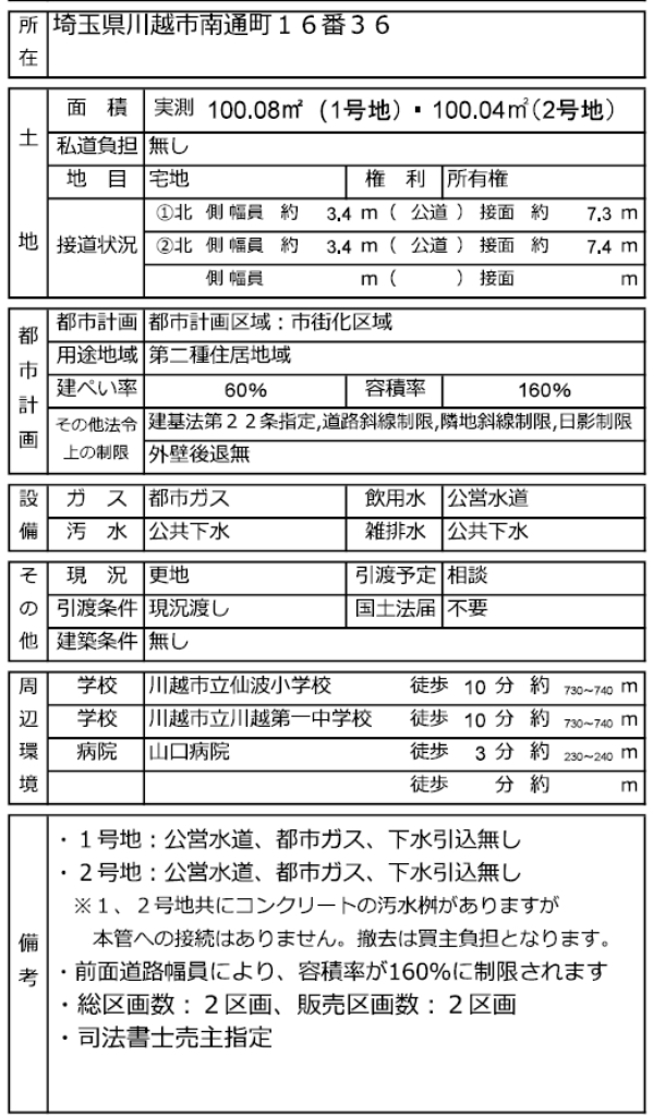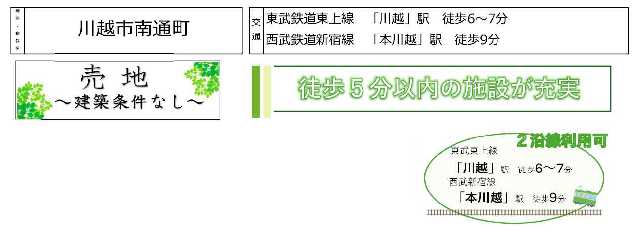 【1号地】 ☆川越市南通町 建築条件無売り地!全2区画 ☆東武東上線『川越駅』徒歩6分! ☆西武新宿線『本川越駅』徒歩9分! ☆敷地面積30坪! ☆建築条件はありません。お好きなハウスメーカーで建築できます! ☆川越市立仙波小学校、川越第一中学校まで徒歩10分の通学距離です! ☆公営水道、公共本下水、都市ガス ☆おひさま保育園(約170m)、丸広百貨店川越(約280m)、クレアモール(約200m)、サンドラッグ川越駅前店(250m)、アトレマルヒロ川越駅前店(約390m)、ドン・キホーテ川越東口店(約340m)、ファミリーまー0と川越八幡通店(約220m) |