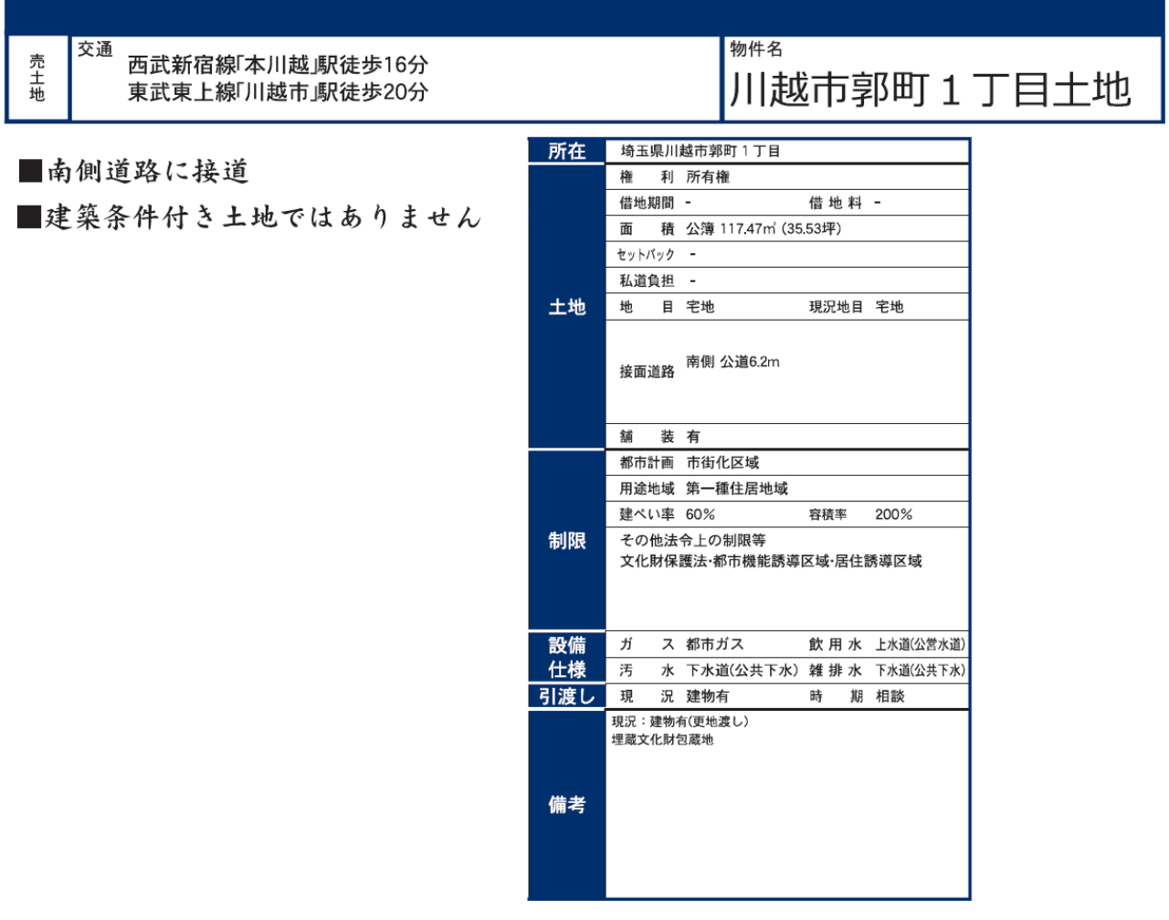 ☆敷地面積35坪! ☆建築条件無し! ☆南道路! ☆川越市立川越小学校まで徒歩3分、初雁中学校まで徒歩9分! ☆公営水道、公共本下水、都市ガス ☆どなたでも建築できる土地です!(34条11号適用含む) |