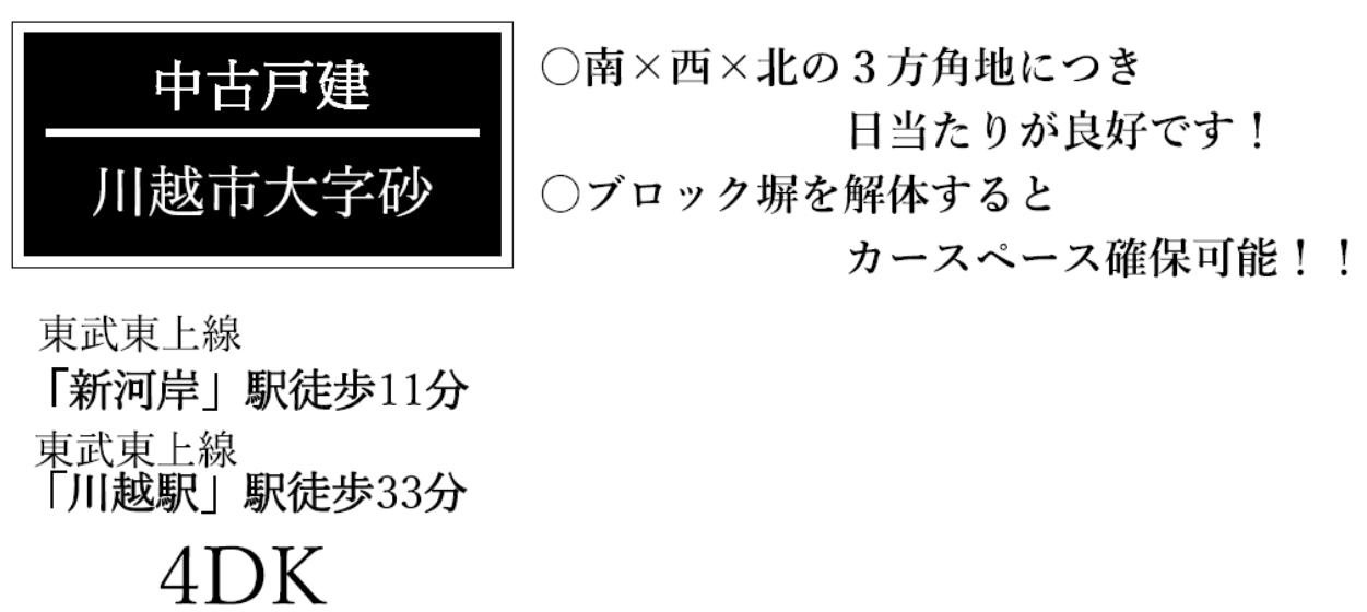 ☆川越市砂 中古戸建て ☆東武東上線『新河岸駅』徒歩11分! ☆敷地面積30坪! ☆昭和49年2月築、4DK中古住宅! ☆ブロック塀を解体するとカースペースを確保することも可能です! ☆南・西・北の3方面道路! ☆川越市立高階小学校、砂中学校の通学区です ☆公営水道、本下水、集中プロパンガス ☆コスモス新河岸店…徒歩8分、セブンイレブン川越砂店…徒歩12分、高階運動広場…徒歩4分、シャトレーゼ川越砂店…徒歩13分 |