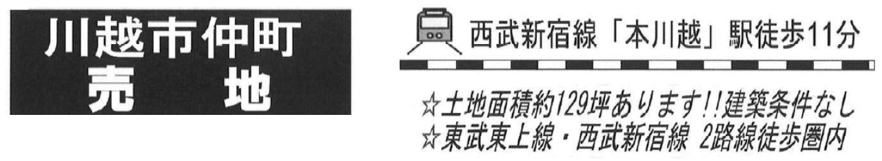 ☆川越市仲町 建築条件無売り地! ☆西武新宿線『本川越駅』徒歩11分! ☆敷地面積129坪! ☆建築条件はありません。お好きなハウスメーカーで建築できます! ☆複数の路線と駅が利用可能! ☆川越市立月越小学校、富士見中学校の通学区です ☆公営水道、公共本下水、都市ガス ☆どなたでも建築できる土地です!(34条11号適用含む) ☆コープみらいコープ仲町(約180m)、マルエツ連雀町店(約500m)、三井病院(約450m)、セブンイレブン仲町店(約20m) |