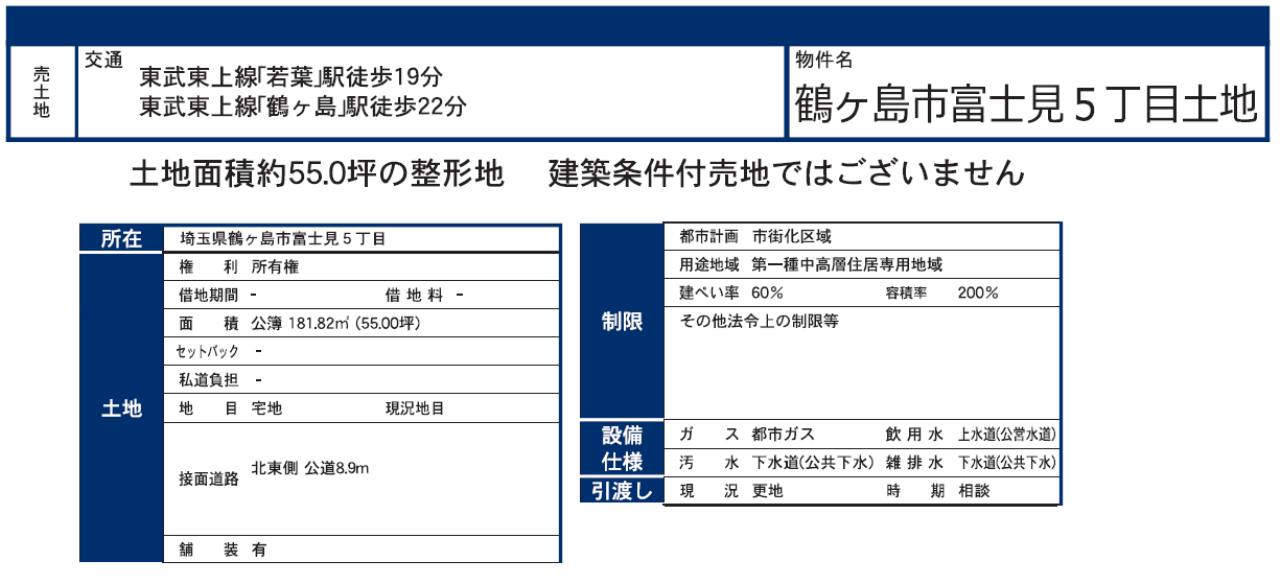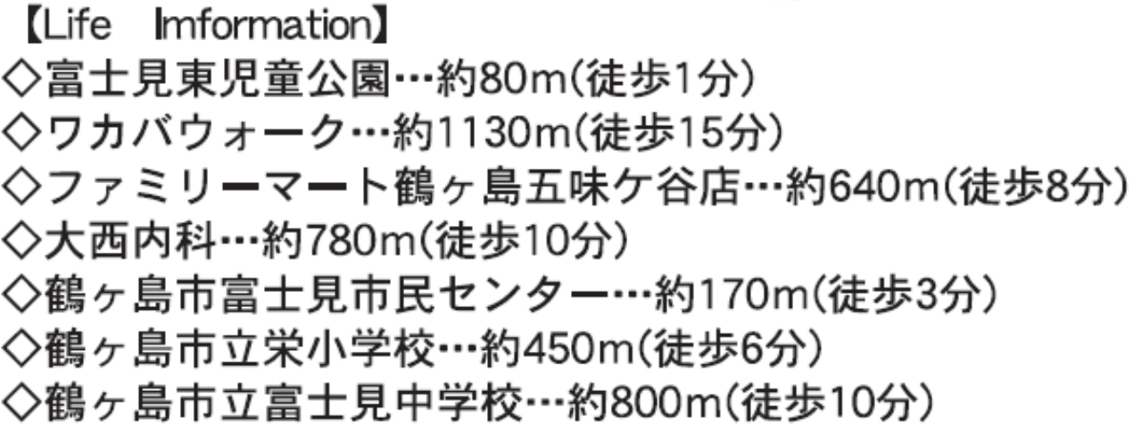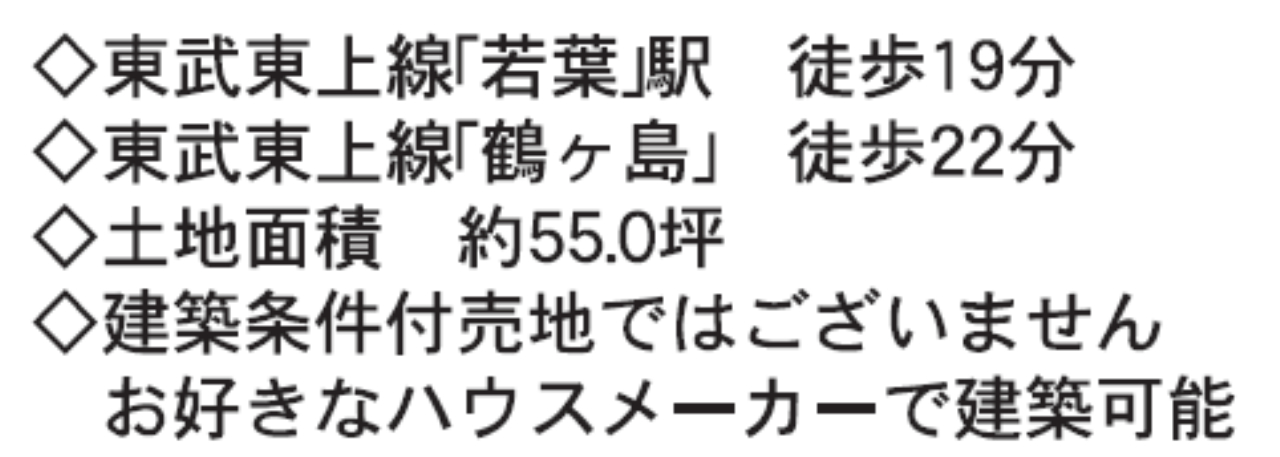 ☆鶴ヶ島市富士見5丁目 建築条件無売り地! ☆東武東上線『若葉駅』徒歩19分、『鶴ヶ島駅』徒歩22分! ☆敷地面積55坪! ☆建築条件はありません。お好きなハウスメーカーで建築できます! ☆ゆとりのある広さの整形地! ☆鶴ヶ島市立栄小学校まで徒歩6分、富士見中学校まで徒歩10分の通学距離です! ☆公営水道、公共本下水、都市ガス ☆どなたでも建築できる土地です!(34条11号適用含む) ☆富士見東児童公園(約80m)、ワカバウォーク(約1130m)、ファミリーマート鶴ヶ島五味ヶ谷店(約640m)、大西内科(約780m)、鶴ヶ島市富士見市民センター(約170m) |