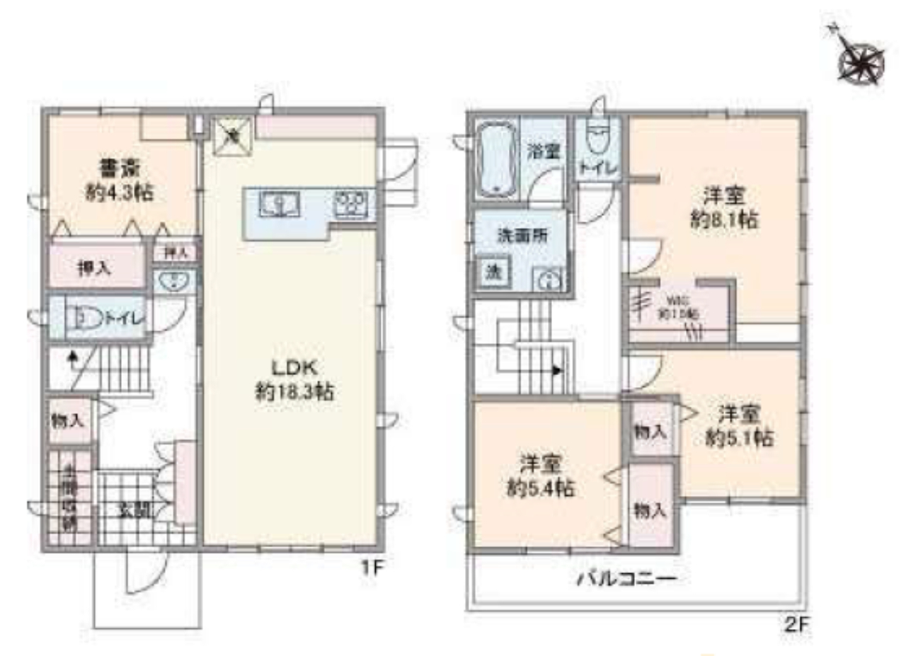 (1F)LDK18.3、(1F)書斎4.3、(2F)洋5.4、(2F)洋5.1、(2F)洋8.1 |