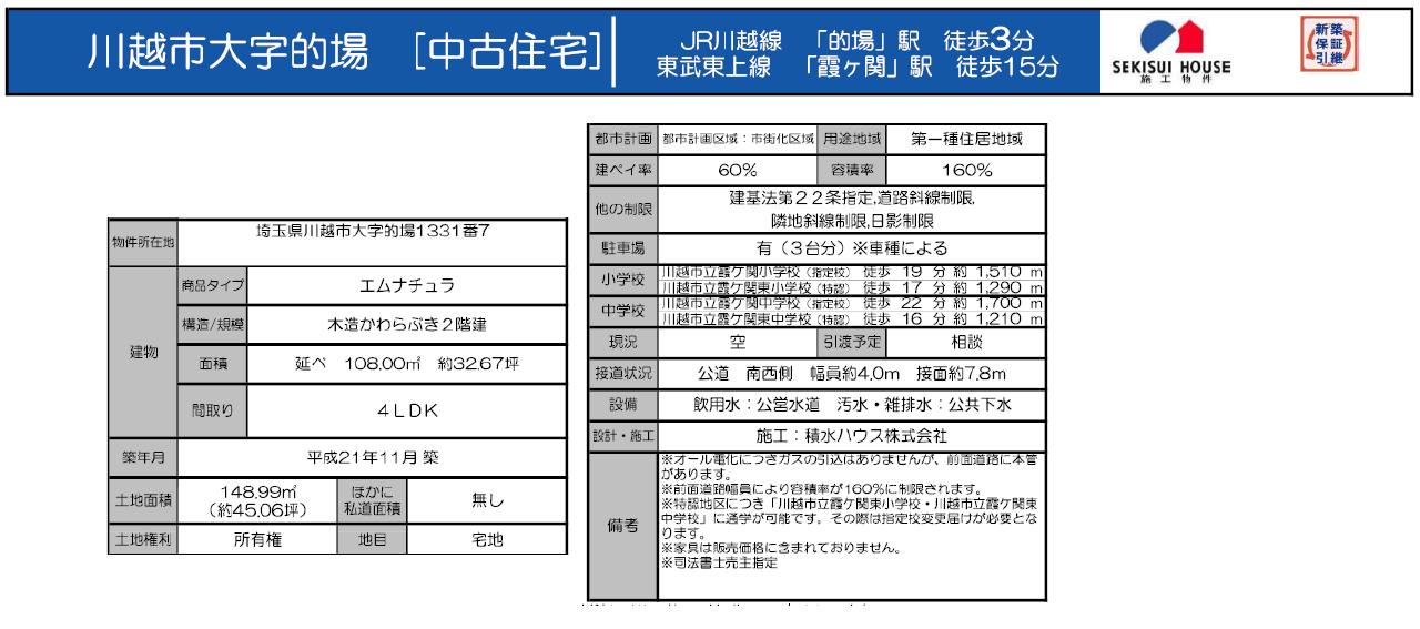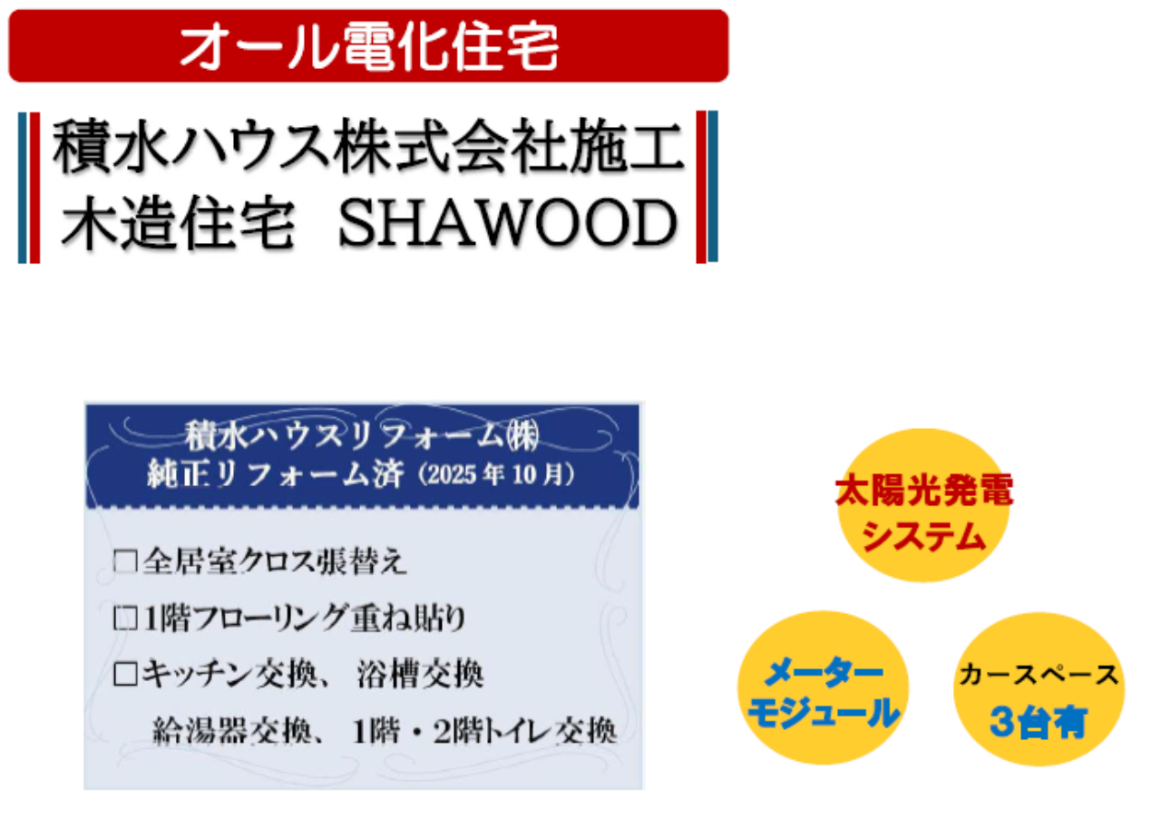 ☆川越市的場 中古戸建て ☆JR川越線『的場駅』徒歩3分! ☆東武東上線『霞ヶ関駅』徒歩15分! ☆敷地面積45坪! ☆平成21年11月築、4LDK中古住宅です! ☆積水ハウス施工のSHAWOOD! ☆令和7年10月リフォーム済み! ☆太陽光発電システム・オール電化! ☆長期優良住宅! ☆建物本体保証継承あり! ☆全室遮断断熱ペアガラス、24時間換気システム、IHクッキングヒーター、電動シャッタなどの設備! ☆安全なバリアフリー住宅! ☆川越市立霞ヶ関小学校、霞ヶ関中学校の通学区です ☆駐車場3台! ☆公営水道、本下水、オール電化 ☆ファミリーマート川越的場店(約300m)、セブンイレブン川越的場駅北店(約280m)、なるかわ内科・脳神経クリニック(約300m)、ベルク的場店(約740m)、ダイレックス川越的場店(約630m)、ザ・マーケットプレイス川越的場店(約1350m) |