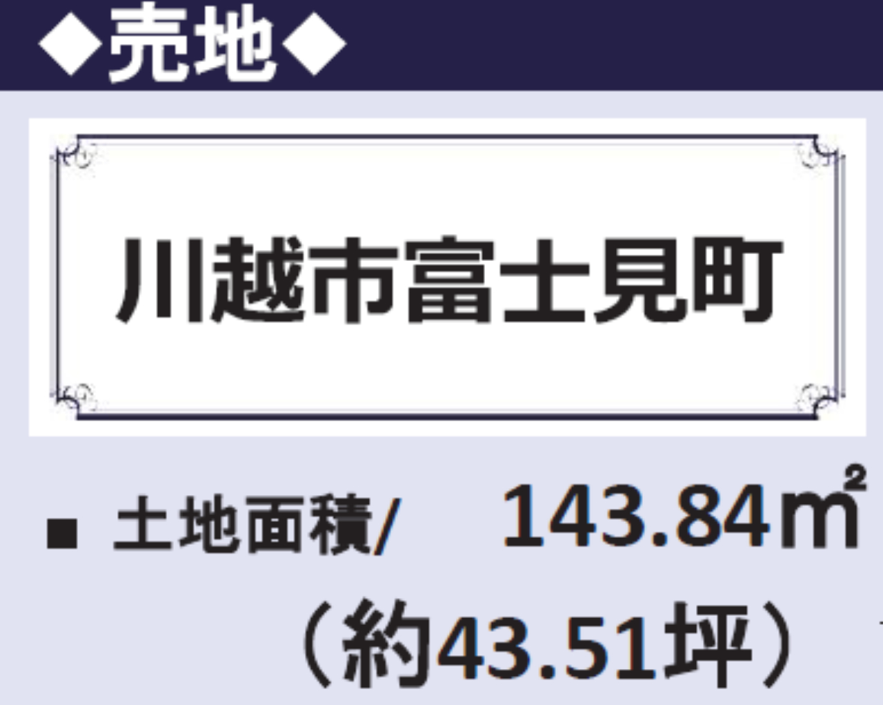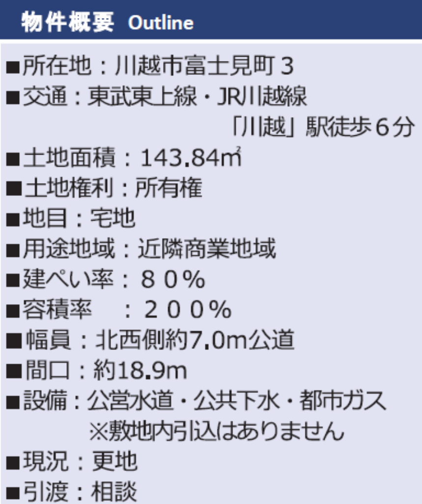 ☆川越市富士見町建築条件無売地 ★仲介手数料半額! ☆東武東上線 川越駅 徒歩6分 ☆土地43坪! ☆公営水道、公共本下水、都市ガス ☆小学校徒歩3分以内! ☆日当り良好! |