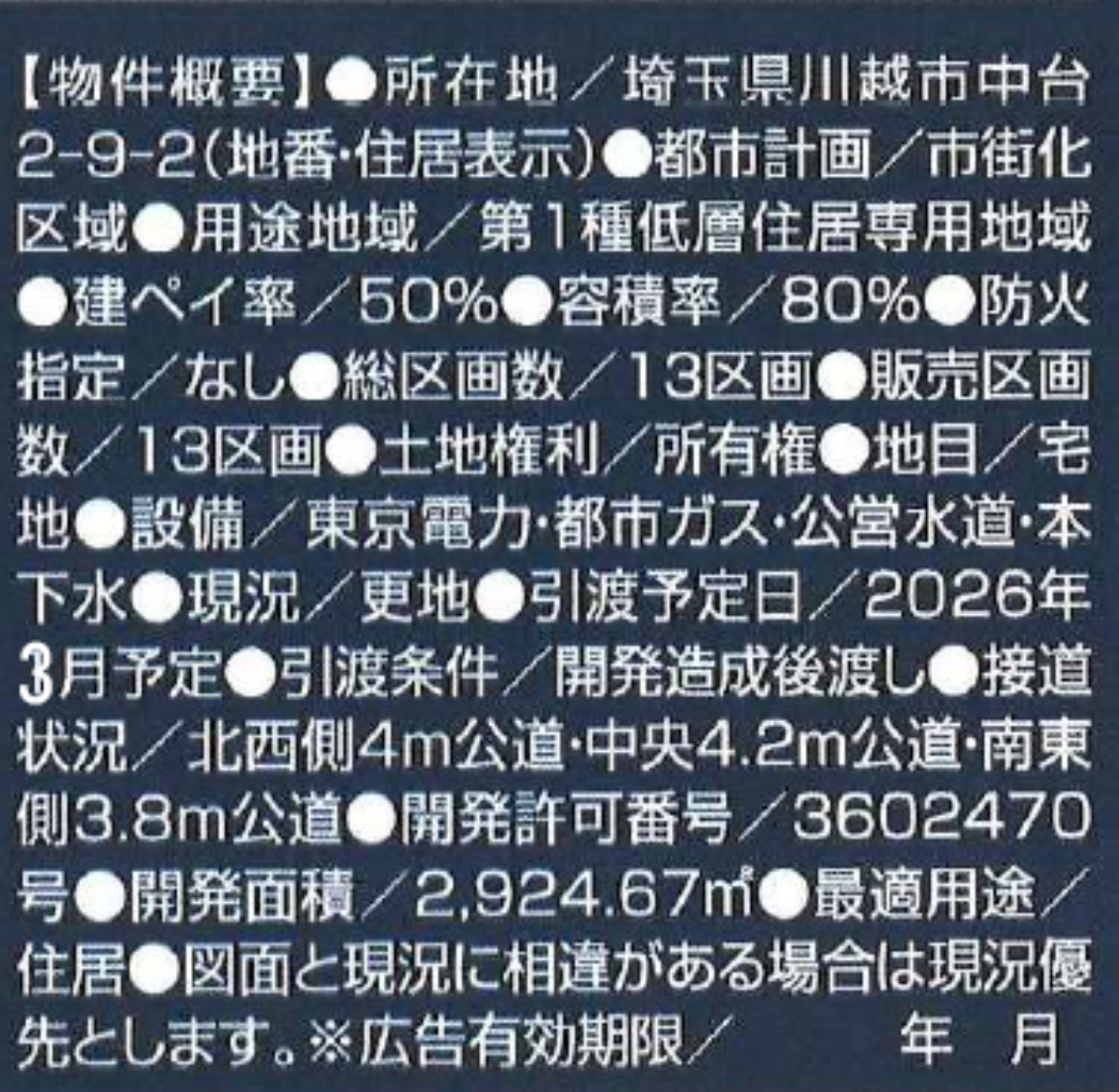 【8区画】 ☆川越市中台 建築条件無し売地!全13区画 ★仲介手数料無料土地! ☆西武新宿線『南大塚駅』徒歩25分! ☆東武東上線『川越駅』バス11分、、バス停『つつじヶ丘住宅入口』停歩6分! ☆土地面積38坪! ☆建築条件はありません。お好きなハウスメーカーで建築できます! ☆近くに公園や商業施設が多数ある住環境! ☆川越市立福原小学校、福原中学校まで徒歩25分の通学距離です! ☆公営水道、本下水、都市ガス ☆どなたでも建築できる土地です!(34条11号適用含む) ☆セブンイレブン川越今福店(約640m)、ヤオコー川越今福店(約1046m)、ドラッグストアセキ今福店(約708m)、川越旭町郵便局(約1398m)、関本記念病院(約830m)、コメリハード&グリーン川越新宿店(約1100m)、ベルク川越むさし野店(約1216m) |
