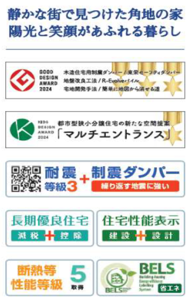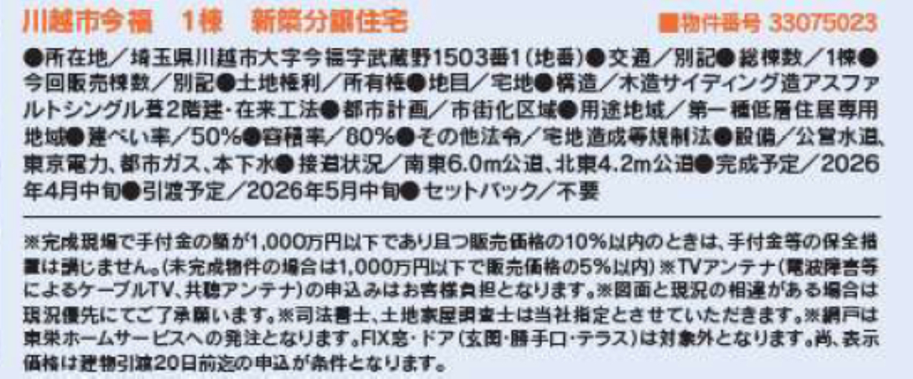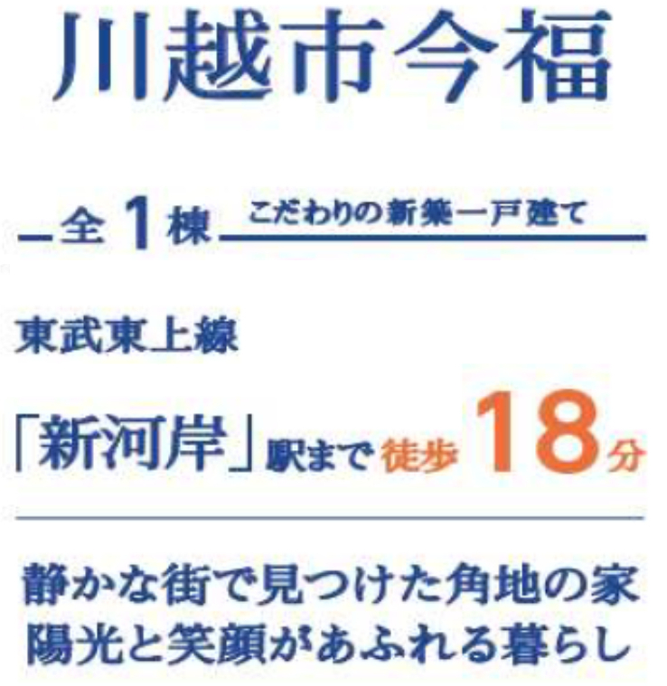 ☆川越市今福 新築一戸建て ※本物件は現在仲介手数料無料でのご紹介は出来ません。 ☆東武東上線『新河岸駅』徒歩18分! ☆敷地面積33坪! ☆ワンフロアタイプのリビングには対面キッチンやカウンターあり! ☆たっぷり収納できるウォークインクローゼット! ☆駐車場2台! ☆南東角地につき陽当たり良好です! ☆食器洗浄乾燥機、システムバス、浴室乾燥機、LED照明、Wロック電池錠、TVモニター付きインターホン、浄水器、節水型トイレ、ハンドシャワー付き洗面化粧台、24時間換気システムなどの設備です! ☆川越市立高階北小学校まで徒歩6分、高階中学校まで徒歩17分の通学距離です! ☆住宅性能評価書取得! フラット35S利用可! ☆耐震・制震ダンパー! ☆長期優良住宅! ☆BELS省エネ! ☆公営水道、本下水、都市ガス ☆高階幼稚園(約975m)、高階第三保育園(約573m)、ファミリーマート川越砂新田店(約478m)、ドラッグエース岸町南店(約660m)、ヤオコー今福店(約950m)、生鮮市場高階店(約1000m)、いなげや川越新河岸店(約1002m)、歌声の杜公園(約294m)、川越市立高階図書館(約1809m)、川越市高階市民センター(約1811m) |