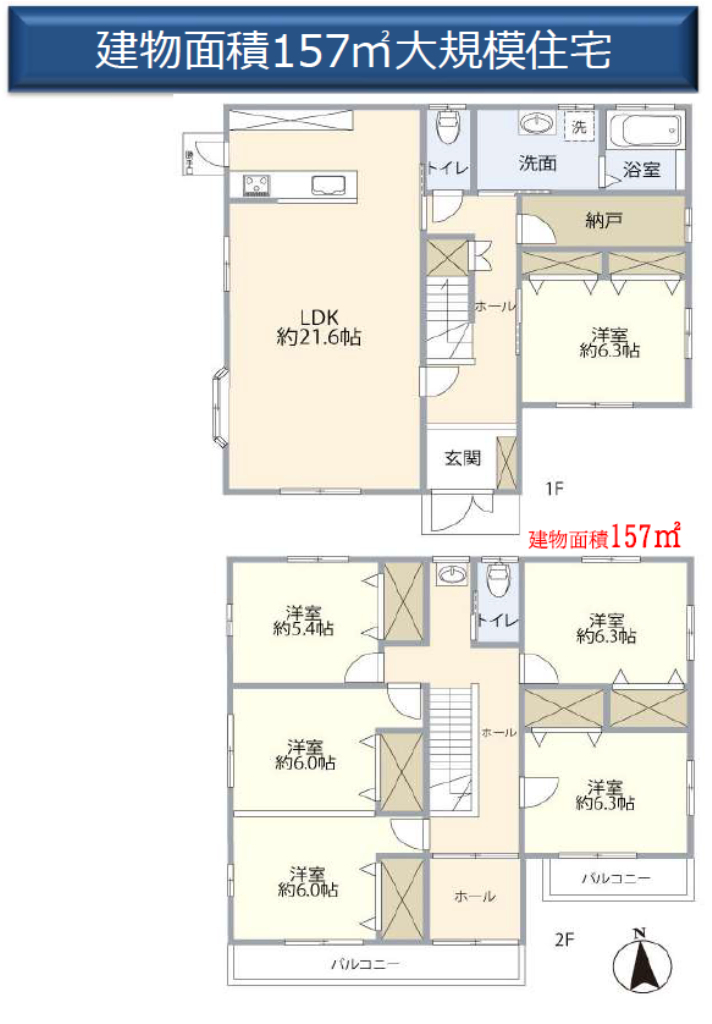 (1F)LDK21.6、(1F)洋6.3、(1F)納戸、(2F)洋5.4、(2F)洋6、(2F)洋6、(2F)洋6.3、(2F)洋6.3 |