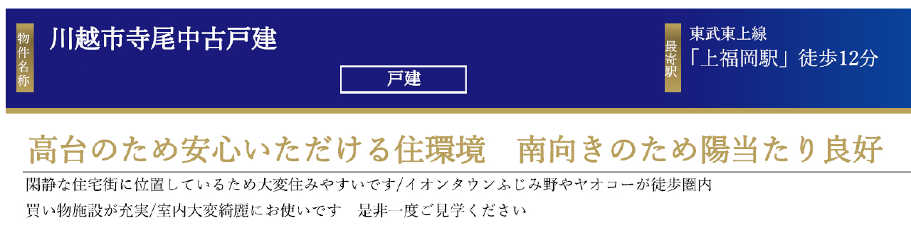☆川越市寺尾 中古戸建て ☆東武東上線『上福岡駅』徒歩12分、『新河岸駅』徒歩26分! ☆敷地面積21坪! ☆昭和62年1月築、3DK中古住宅です! ☆温水洗浄便座、浴室乾燥機、追い炊き機能、シャワー付き洗面化粧台、システムキッチン、エアコン、モニター付きインターホン、24時間換気システムなどの設備! ☆駐車場1台! ☆南道路につき陽当たり良好! ☆毛呂山町立毛呂山小学校、毛呂山中学校の通学区です ☆公営水道、本下水、都市ガス |