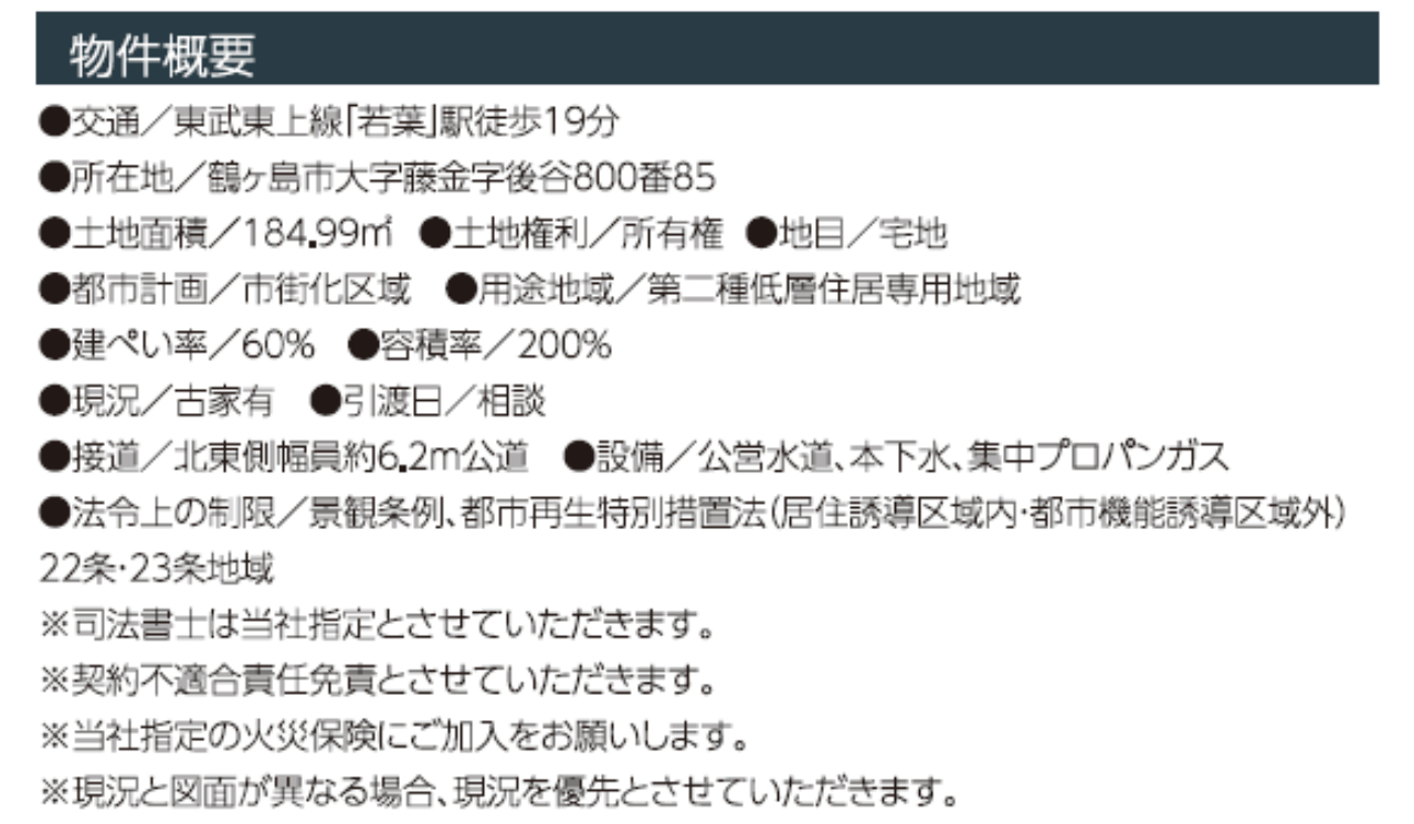 ☆鶴ヶ島市藤金 建築条件無し売地! ☆東武東上線『若葉駅』徒歩19分! ☆土地面積55坪! ☆建築条件はありません。お好きなハウスメーカーで建築できます! ☆ゆとりのある広さの整形地! ☆鶴ヶ島市立第一小学校、鶴ヶ島中学校の通学区です ☆公営水道、本下水、集中プロパンガス ☆どなたでも建築できる土地です!(34条11号適用含む) ☆さかえ保育園(約1300m)、かもめ保育園(約1300m)、つくし幼稚園(約1400m)、かみひろや幼稚園(約1600m)、星和鶴ヶ島公園(約110m)、ベルクすねおり店(約850m)、生鮮食材市場ビッグマーケット鶴ヶ島店(約1100m)、カインズ鶴ヶ島店(約1700m)、ベイシア鶴ヶ島店(約2400m)、ドラッグストアセキ藤金店(約650m)、セブンイレブン(約550m) |