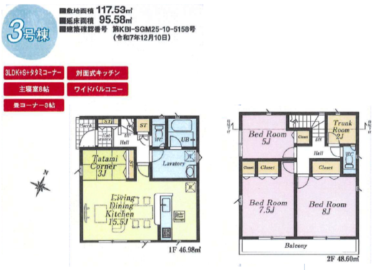 (1F)LDK15.5、(1F)畳コーナー3、(2F)洋7.5、(2F)洋8、(2F)洋5、(2F)トランクルーム2 |
