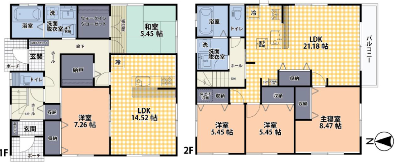 (1F)LDK14.52、(1F)和7.26、(1F)洋7.26、(1F)納戸2、(1F)納戸2、(2F)LDK21.8、(2F)洋8.47、(2F)洋5.45、(2F)洋5.45 |