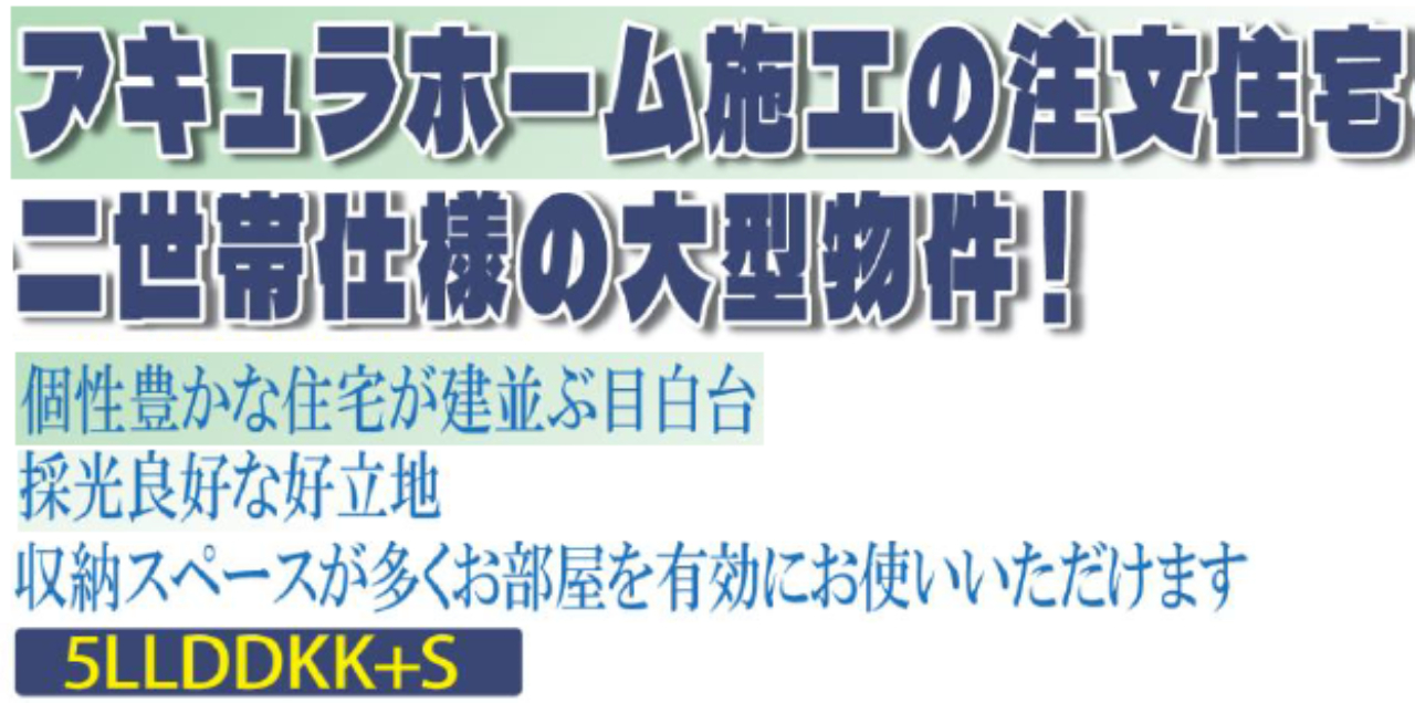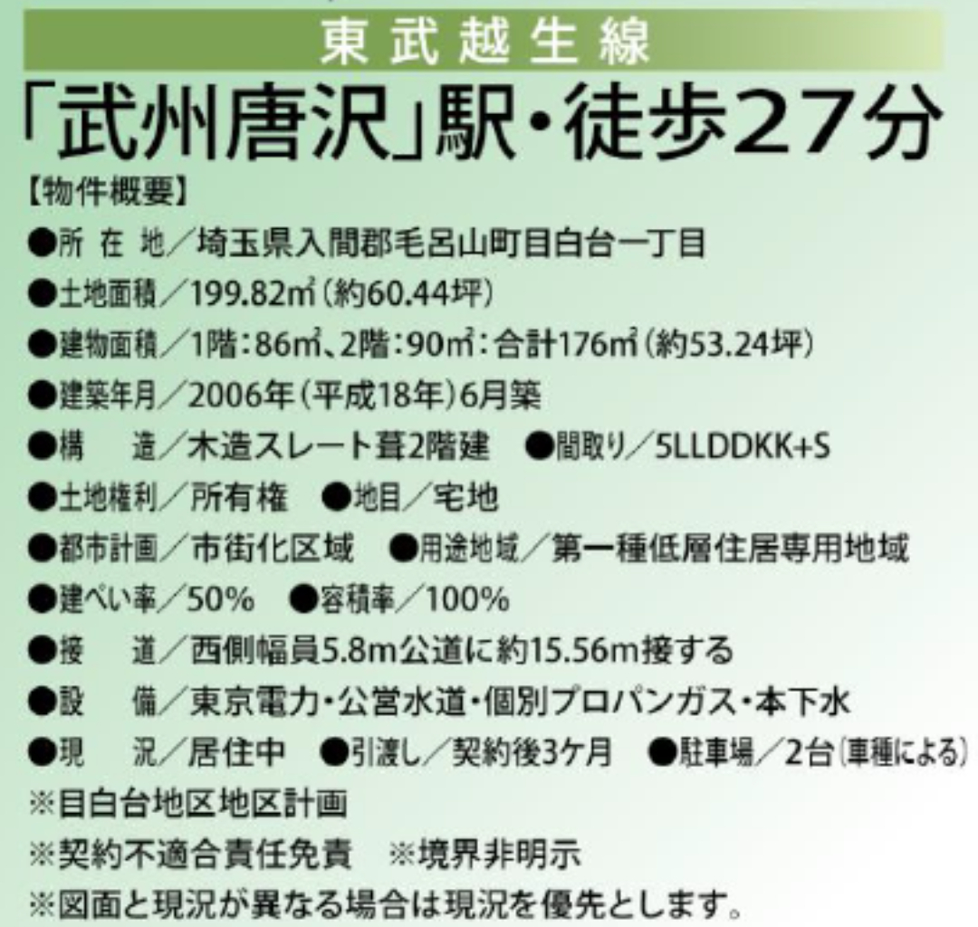 ☆毛呂山町目白台1丁目 二世帯注文住宅! ☆アキュラホーム施工の注文二世帯住宅です。 ☆一世帯5LDK+LDKとしての使用も可能です! ☆綺麗な町並みのガーデンシティ目白台です。 ☆玄関・LDK・浴室・トイレ完全分離二世帯住宅です。 ☆収納も豊富で大家族でも余裕の居住スペースです。 ☆浴室乾燥機ユニットバス! ☆駐車場2台 ☆公営水道、本下水、集中プロパンガス ☆法令等制限:ガーデンシティ目白台地区地区計画 ☆イオンスタイル毛呂山まで車で約9分です! |
