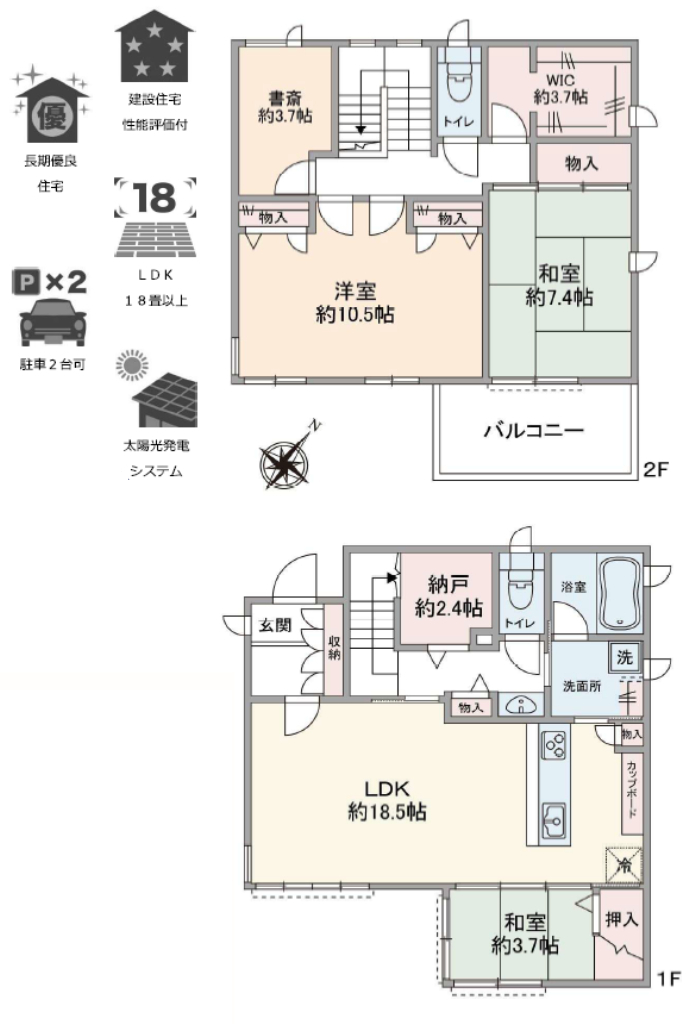 (1F)LDK18.5、(1F)納戸2.4、(1F)和3.7、(2F)和7.4、(2F)洋10.5、(2F)書斎3.7 |
