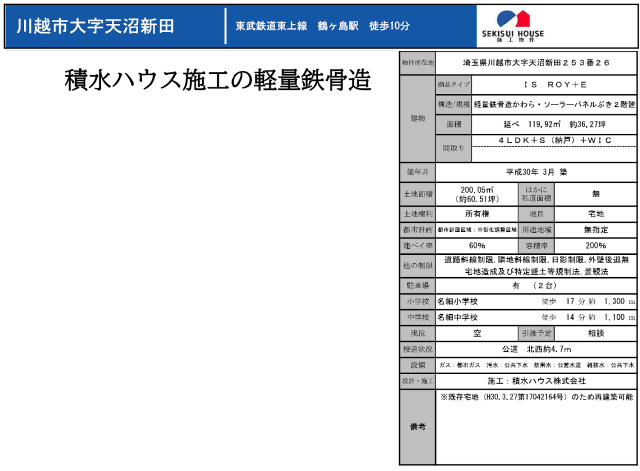 ☆川越天沼新田 中古戸建て! ☆東武東上線『鶴ヶ島駅』徒歩10分! ☆敷地面積60坪! ☆積水ハウス施工の軽量鉄骨造! ☆平成30年3月完成、築10年以内の建物です! ☆太陽光発電搭載! ☆広々した18帖以上のリビング、には対面キッチン付き! ☆収納が充実した家! ☆テレワークや作業スペースに最適な書斎有り! ☆駐車場2台! ☆川越市立名細小学校まで徒歩17分、名細中学校まで徒歩14分の通学距離です! ☆公営水道、本下水、都市ガス ☆エコスTAIRAYA上広谷店(約520m)、ファミリーマート川越天沼店(約410m)、セイジョー五味ヶ谷店(約340m)、やえがき公園(約870m)、名細第二保育園(約630m) |