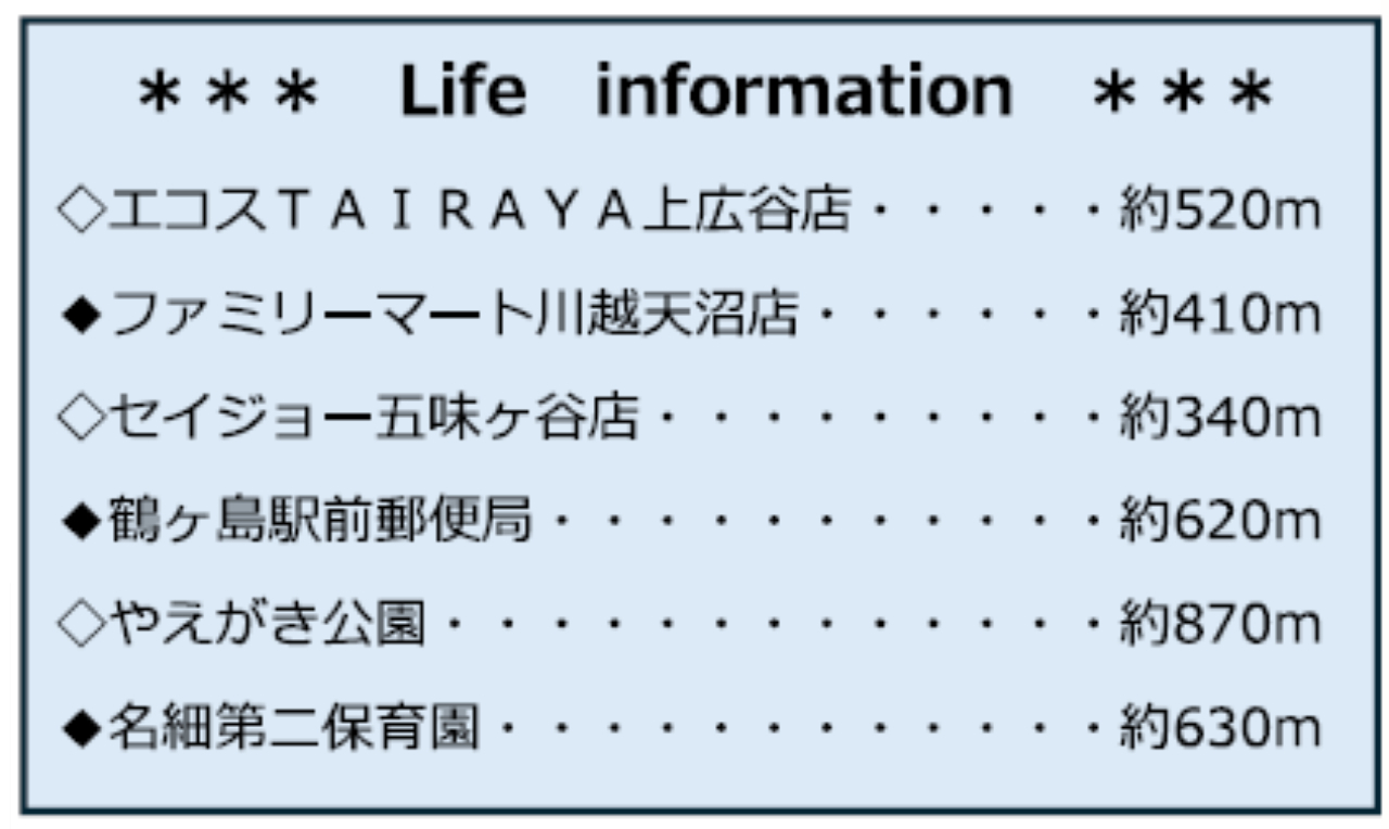 東武東上線鶴ヶ島駅まで 徒歩10分 |