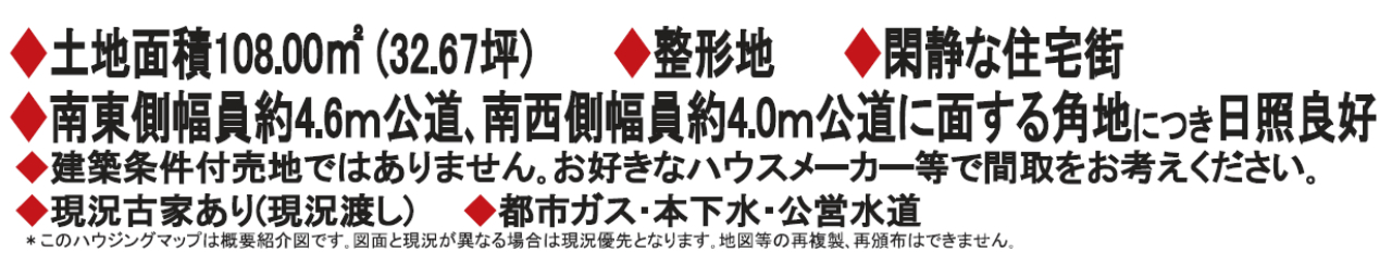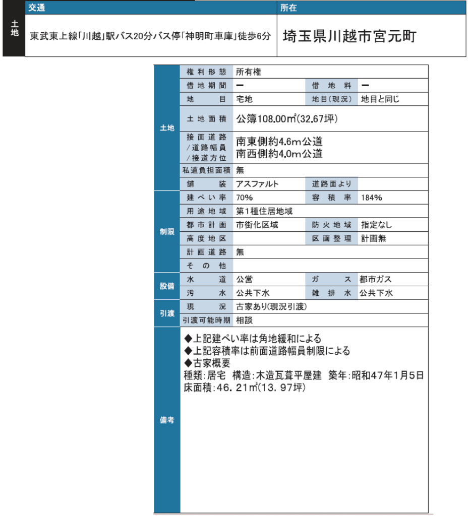 ☆川越市宮元町 建築条件無売地 ☆東武東上線『川越駅』バス20分、バス停『神明町車庫』停歩6分! ☆土地面積32坪! ☆南西・南東道路に面した陽当りの良い角地! ☆閑静な住宅街! ☆建築条件はありません。お好きなハウスメーカーで建築できます! ☆現況古家あり ☆川越市立川越小学校、初雁中学校の通学区です ☆公営水道、公共本下水、都市ガス |