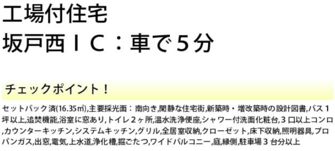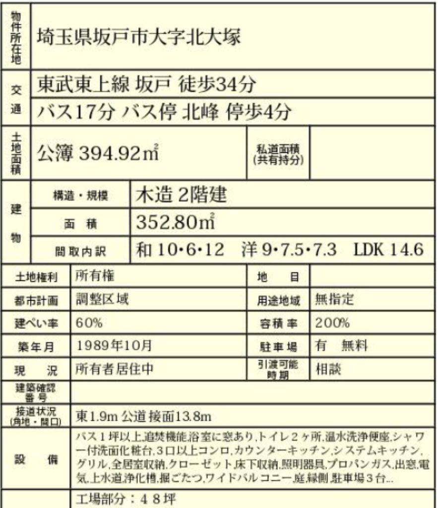 ☆坂戸市北大塚 工場兼倉庫付住宅 ☆坂戸ICまで車で5分! ☆公営水道、合併浄化槽、プロパンガス ☆駐車場2台 |