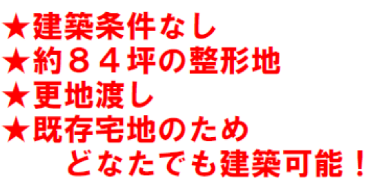 ☆敷地面積84坪! ☆更地渡しです。 ☆測量済みです! ☆どなたでも建築できる土地です! ☆公営水道、合併浄化槽、プロパンガス ☆日当り良好! |