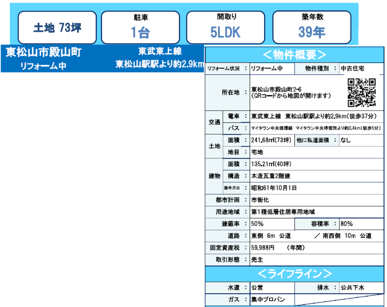 ☆東松山市殿山町 中古戸建て! ★仲介手数料無料中古一戸建て! ☆東武東上線『東松山駅』徒歩37分! ☆敷地面積73坪! ☆昭和61年10月築、5LDK中古住宅! ☆敷地も広く、部屋数の多い家! ☆リフォーム後の引渡しです! ☆2年間の保証付き! ☆シロアリ防除工事を実施後引渡し! ☆駐車場1台! ☆東松山市立第二小学校、北中学校の通学区です ☆公営水道、本下水、集中プロパンガス ☆マミープラス沢口店(約700m)、ローソン向台店(約350m)、東松山市民病院(約800m) |