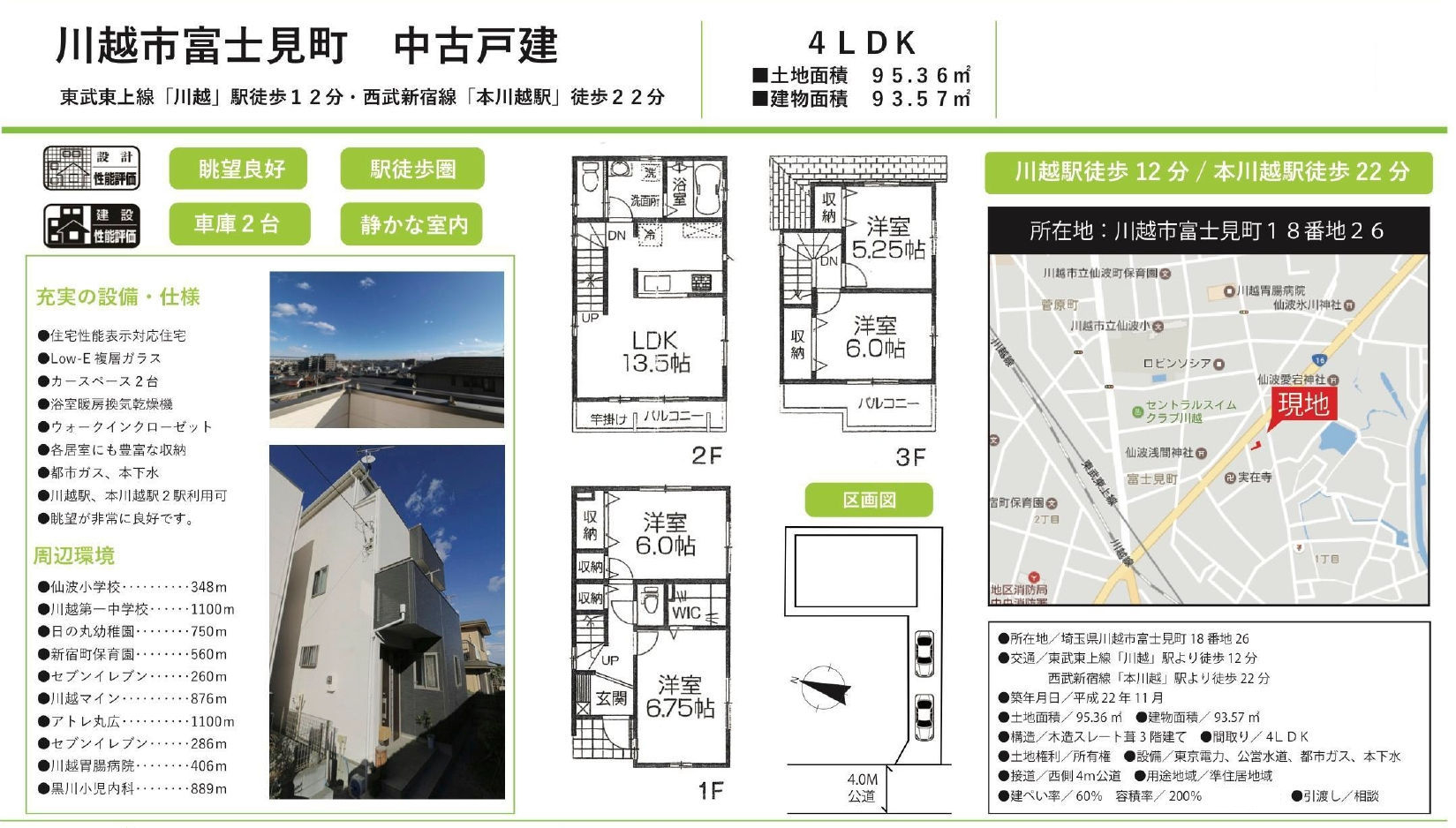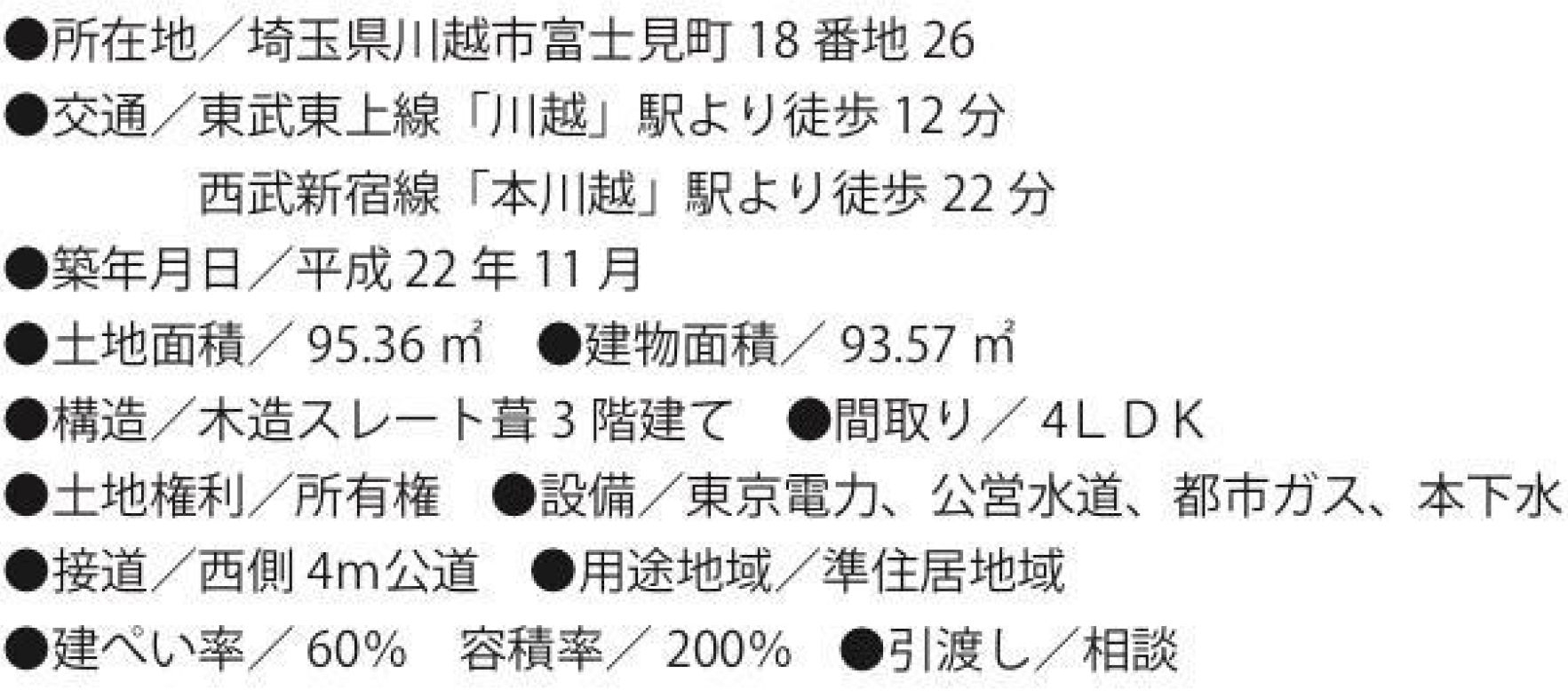 ☆川越市富士見町中古戸建! ☆平成22年築の築浅3階建て! ☆東武東上線「川越駅」徒歩12分 ☆駐車場2台駐車可! ☆公営水道、都市ガス、本下水 ☆日当り良好! ☆ベランダからは気持ち良い見晴らしです! |
