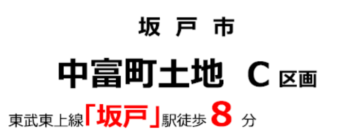 ☆坂戸市中富町 建築条件無売り地!C区画 ★仲介手数料無料土地! ☆東武東上線『坂戸駅』徒歩8分! ☆土地面積40坪! ☆建築条件はありません。お好きなハウスメーカーで建築できます! ☆前面道路6m! ☆陽当り良好! ☆坂戸市立浅羽野小学校、浅羽野中学校の通学区です ☆公営水道、公共本下水、都市ガス ☆どなたでも建築できる土地です!(34条11号適用含む) |