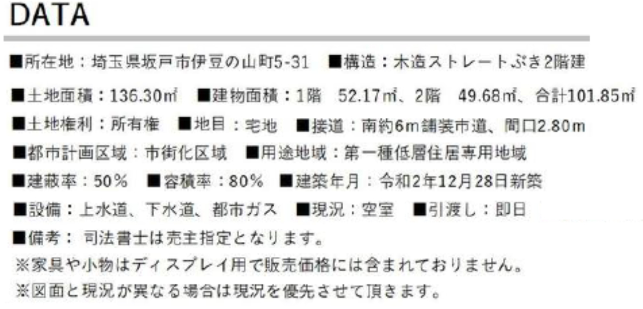 ☆坂戸市伊豆の山町中古一戸建て ☆令和2年築の築浅中古戸建て ☆東武東上線『北坂戸駅』徒歩13分! ☆敷地面積41坪! ☆対面キッチンを備えたリビングは19帖あり広々シています! ☆アイロンがけや洗濯など家事が捗るユーティリティーあり! ☆突然の雨でも安心なインナーバルコニー! ☆TVモニター付きインターホン、ペアガラス、1坪サイズバリアフリーのユニットバス、カードキーなどの設備です! ☆駐車場2台! ☆坂戸市立桜小学校まで徒歩2分、桜中学校まで徒歩9分の通学距離です! ☆公営水道、本下水、都市ガス ☆ローソン(約415m)、ヤオコー(約695m) |