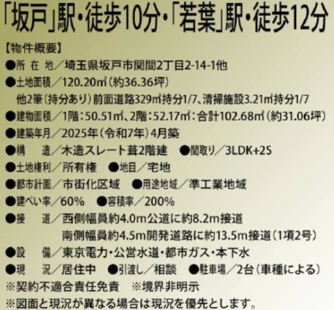 ☆坂戸市関間2丁目大和ハウス施工の中古戸建て ☆2025年築の築浅中古戸建てです! ☆角地 ☆南道路 ☆駐車場2台 ☆公営水道、本下水、都市ガス ☆日当り良好! ☆築10年以内の築浅物件! |