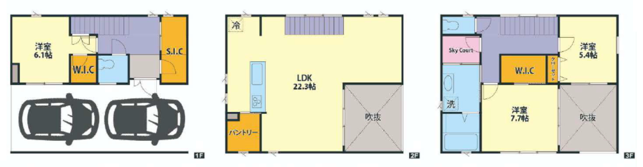 (1F)洋6.1、(2F)LDK22.3、(3F)洋7.7、(3F)洋5.4 |