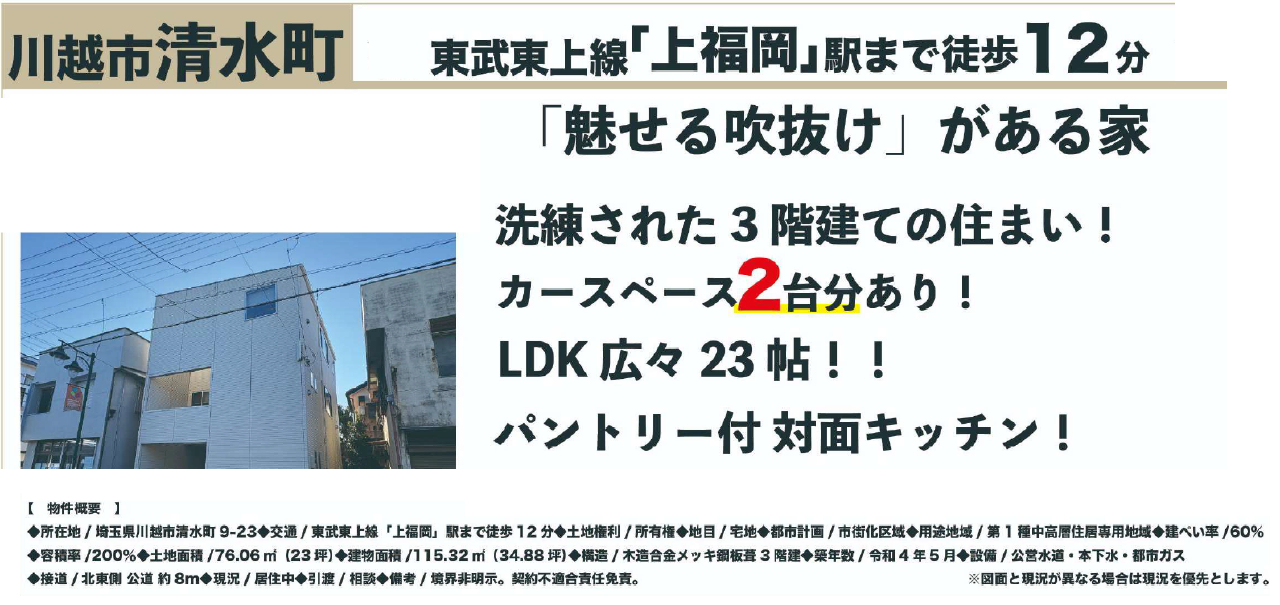 ☆川越市清水町 中古戸建て ☆東武東上線『上福岡駅』徒歩12分! ☆敷地面積23坪! ☆人目が気にならない2階のリビングは吹き抜けで開放感のあるお部屋です! ☆収納スペースが豊富な家! ☆駐車場2台! ☆平成4年5月築、築浅のきれいな建物! ☆川越市立高階南小学校、寺尾中学校の通学区です ☆公営水道、本下水、都市ガス ☆ローソン(約70m)、コモディイイダ(約290m) |
