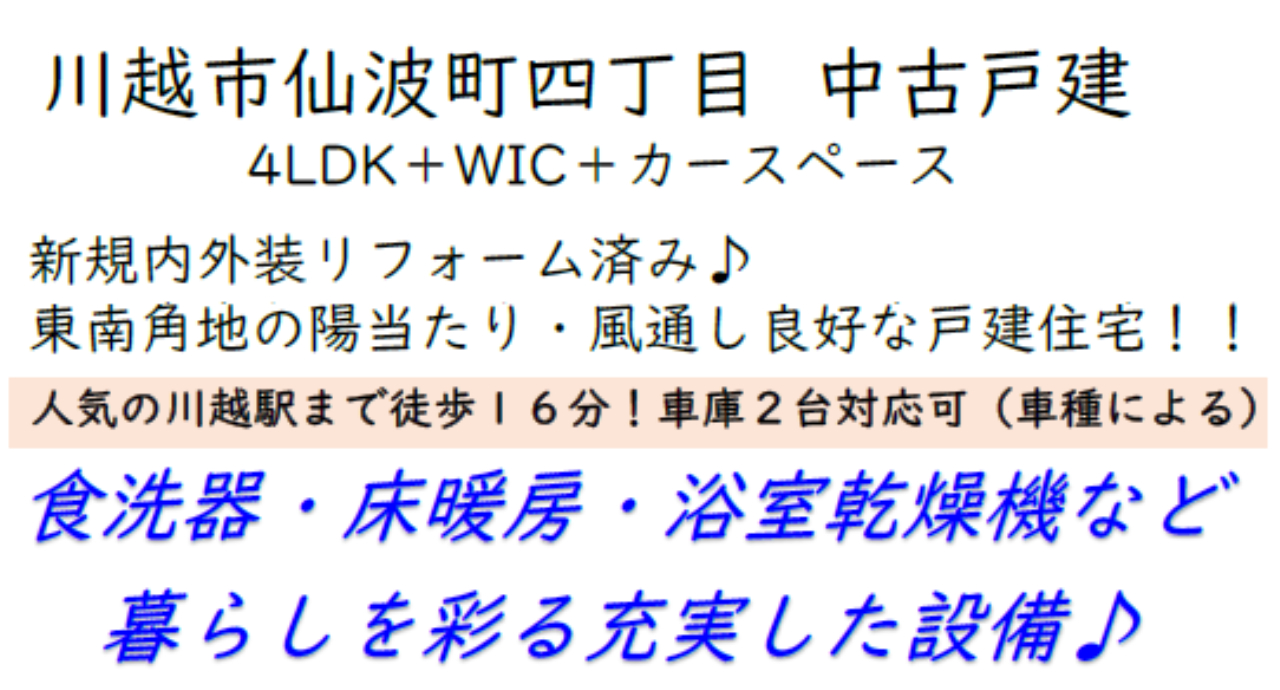☆川越市仙波町4丁目 中古戸建て ★仲介手数料半額 ☆リフォーム令和7 年12 月末完了済み! ☆南東6m・南西4.2m道路の角地! ☆全室南向きの4LDKです。 ☆床暖房付きLDKです! ☆ウォークインクローゼット! ☆南面バルコニー ☆浴室乾燥機ユニットバス! ☆駐車場 ☆公営水道、本下水、都市ガス ☆日当り良好! |
