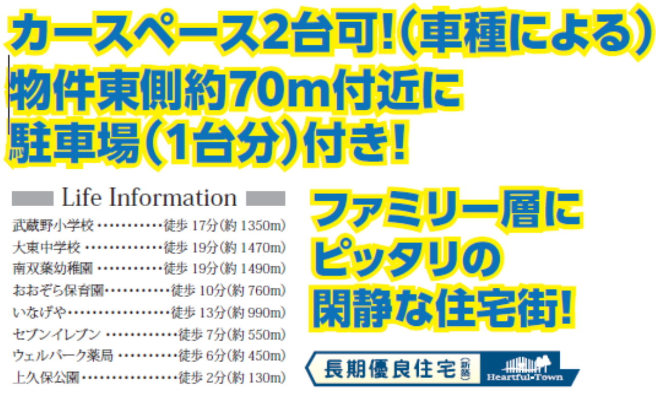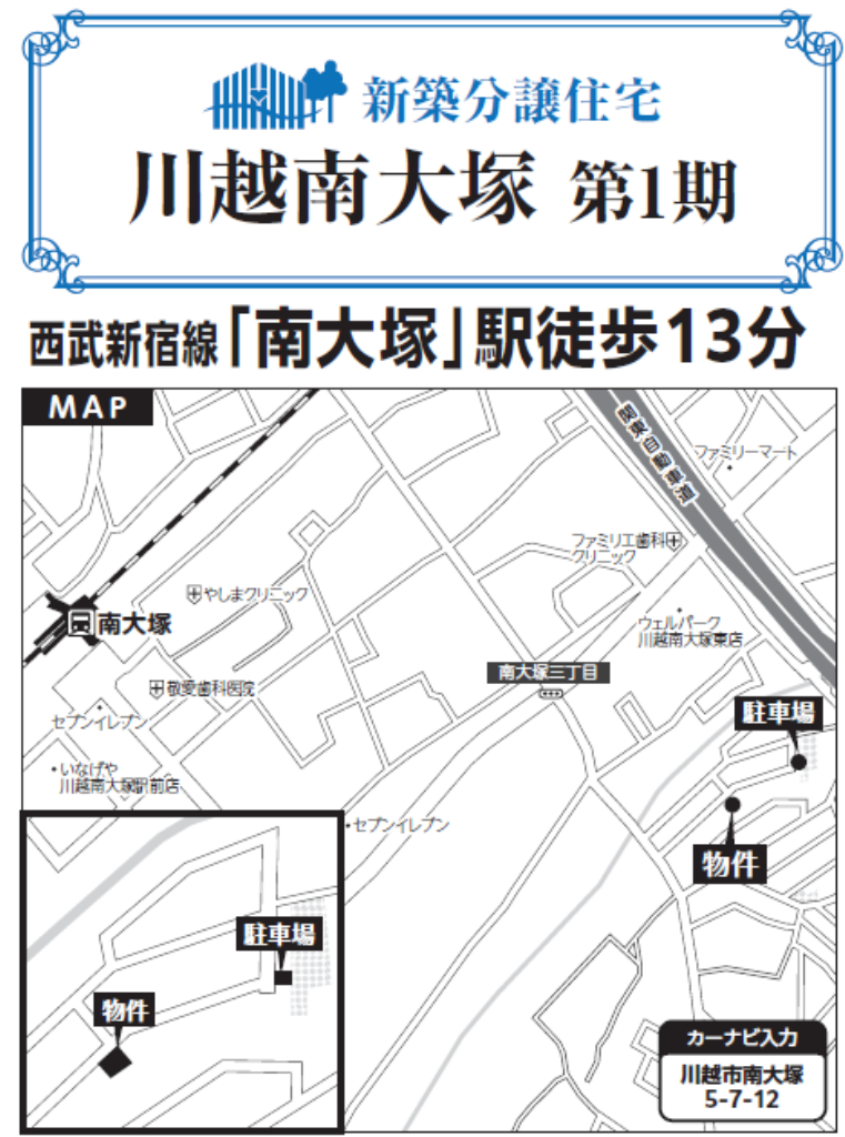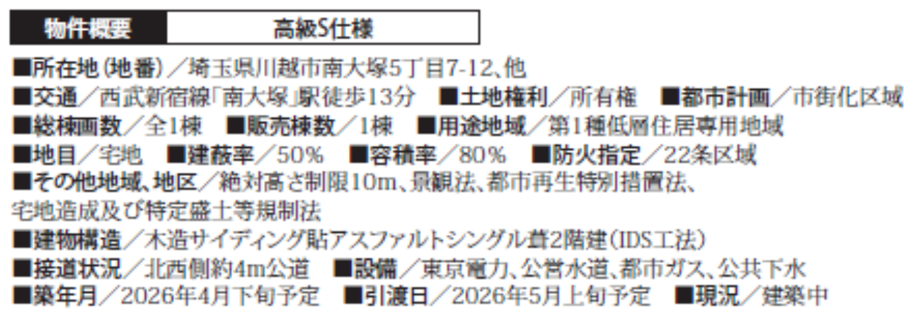 ☆川越市南大塚 第1期 新築一戸建て ★新築仲介手数料無料! ☆住宅性能評価書取得予定物件! ☆フラット35S利用可! ☆駐車場2台 ☆公営水道、本下水、都市ガス ☆17.12帖のゆとりあるLDK。 ☆全室収納付き ☆ファミリー層に配慮された間取りです。 ☆耐震等級や劣化対策等級など、6項目で「設計住宅性能評価書」の最高等級を取得しています。 ☆長期優良住宅につき国の基準を満たした、長く安心して住める認定住宅です。 ☆IDS工法スケルトンインフィル住宅(耐久性の高い構造体と、柔軟に変更可能な内装・設備)を採用しています。 ☆上久保公園:徒歩2分 ☆セブンイレブン:徒歩7分 ☆ウェルパーク(薬局):徒歩6分 ☆いなげや(スーパー):徒歩13分 ☆武蔵野小学校:徒歩17分 ※現地販売業者さんは売主ではございません。 アンケート等の手続きをされますと当社での物件紹介(仲介料手数料無料)が出来なくなります。ご内覧を希望のお客様は当社にて立ち合い・ご案内をさせて頂きますのでお手数ですがTEL049-285-6300までお電話下さい。急いで現地へ向かいますので御連絡お待ちしております。(^o^) |