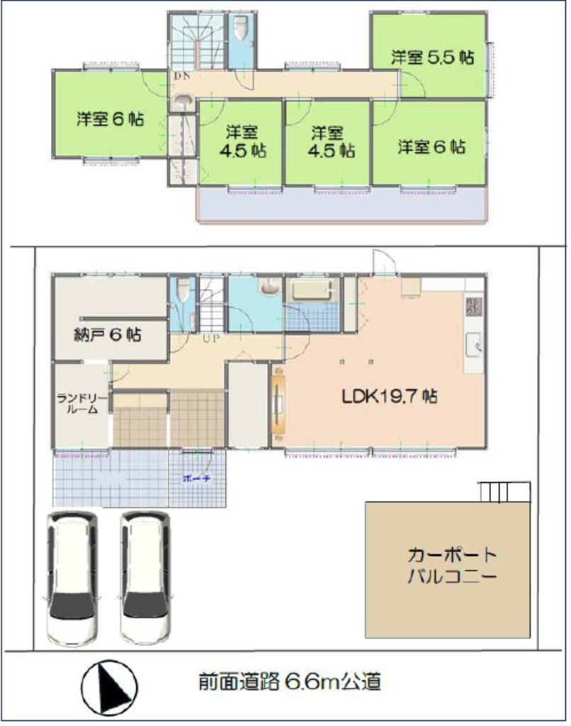(1F)LDK19.7、(1F)納戸6、(2F)洋5.5、(2F)洋6、(2F)洋6、(2F)洋4.5、(2F)洋4.5 |