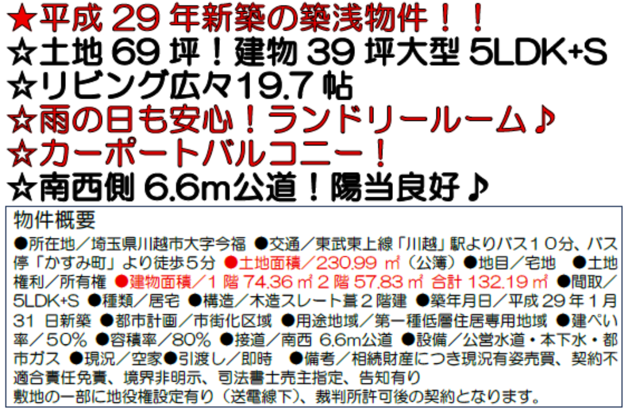 ☆川越市今福中古戸建て ☆平成29年築の築浅中古住宅! ☆土地69坪!建物39坪!大型5SLDK! ☆雨の日も安心のランドリースペースあり! ☆カーポートバルコニー付きの家 ☆東武東上線「川越駅」徒歩32分 ☆西武新宿線「南大塚駅」徒歩38分 ☆南西6.6m道路 ☆公営水道、こだわりの家、本下水、プロパンガス ☆川越市立福原小学校・川越市立福原中学校通学区! ※告知事項あり詳細は担当者まで。 |