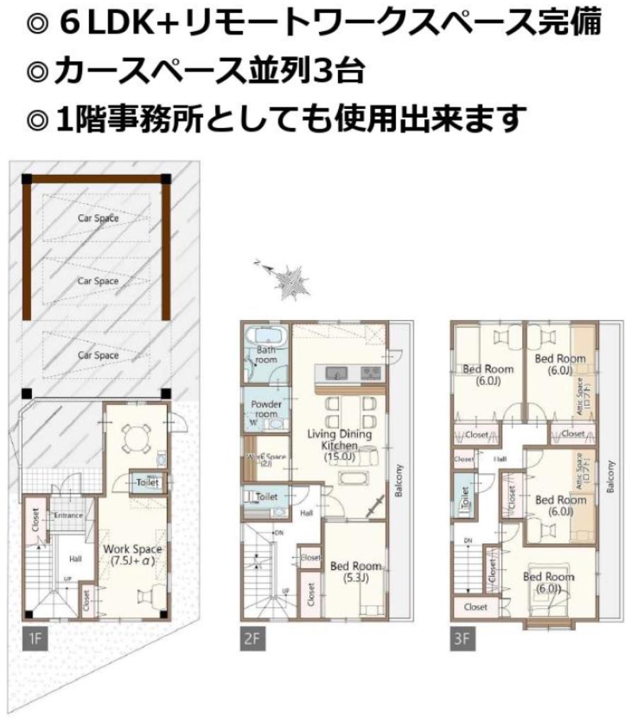 (1F)書斎7.5、(2F)LDK15、(2F)洋5.3、(3F)洋6、(3F)洋6、(3F)洋6、(3F)洋6 |
