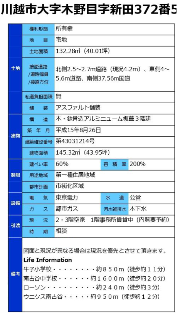 JR川越線南古谷駅まで 徒歩11分 |