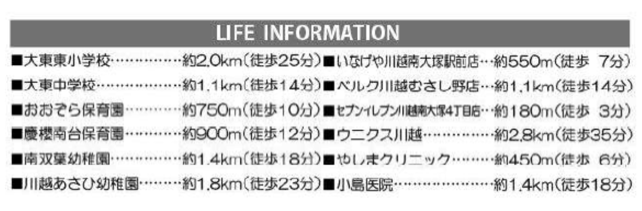 【2区画】 ☆川越市南大塚4丁目 建築条件無売り地!全6区画 ☆西武新宿線『南大塚駅』徒歩6分! ☆土地面積56坪! ☆建築条件はありません。お好きなハウスメーカーで建築できます! ☆全区画50~70坪のゆとりある広さ! ☆川市立大東東小学校、大東中学校の通学区です ☆公営水道、公共本下水、都市ガス ☆どなたでも建築できる土地です!(34条11号適用含む) ☆おおぞら保育園(約750m)、慶櫻南台保育園(約900m)、南双葉幼稚園(約1400m)、川越あさひ幼稚園(約1800m)、いなげや川越南大塚駅前店(約550m)、ベルク川越むさし野店(約1100m)、セブンイレブン川越南大塚4丁目店(約180m)、ウニクス川越(約2800m)、やしまクリニック(約450m)、小島医院(約1400m) |