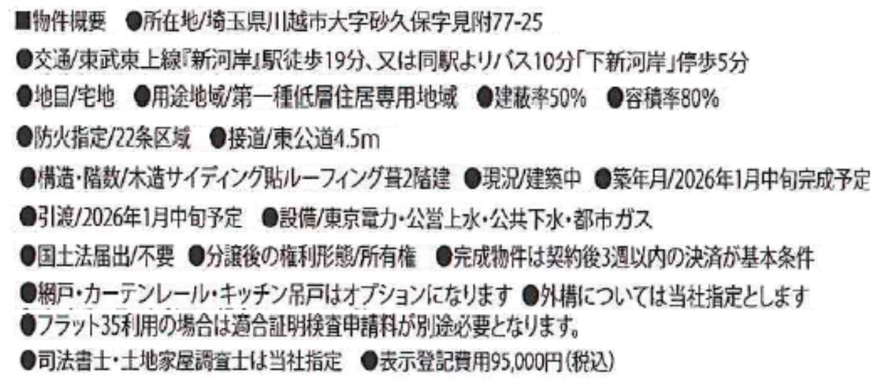 ☆川越市砂久保 新築一戸建て ★新築仲介手数料無料! ☆住宅性能評価書取得予定物件! ☆フラット35S利用可! ☆駐車場2台 ☆公営水道、本下水、都市ガス ※現地販売業者さんは売主ではございません。アンケート等の手続きをされますと当社での物件紹介(仲介料手数料無料)が出来なくなります。ご内覧を希望のお客様は当社にて立ち合い・ご案約をさせて頂きますのでお手数ですがTEL049-285-6300までお電話下さい。急いで現地へ向かいますので御連絡お待ちしております。 |