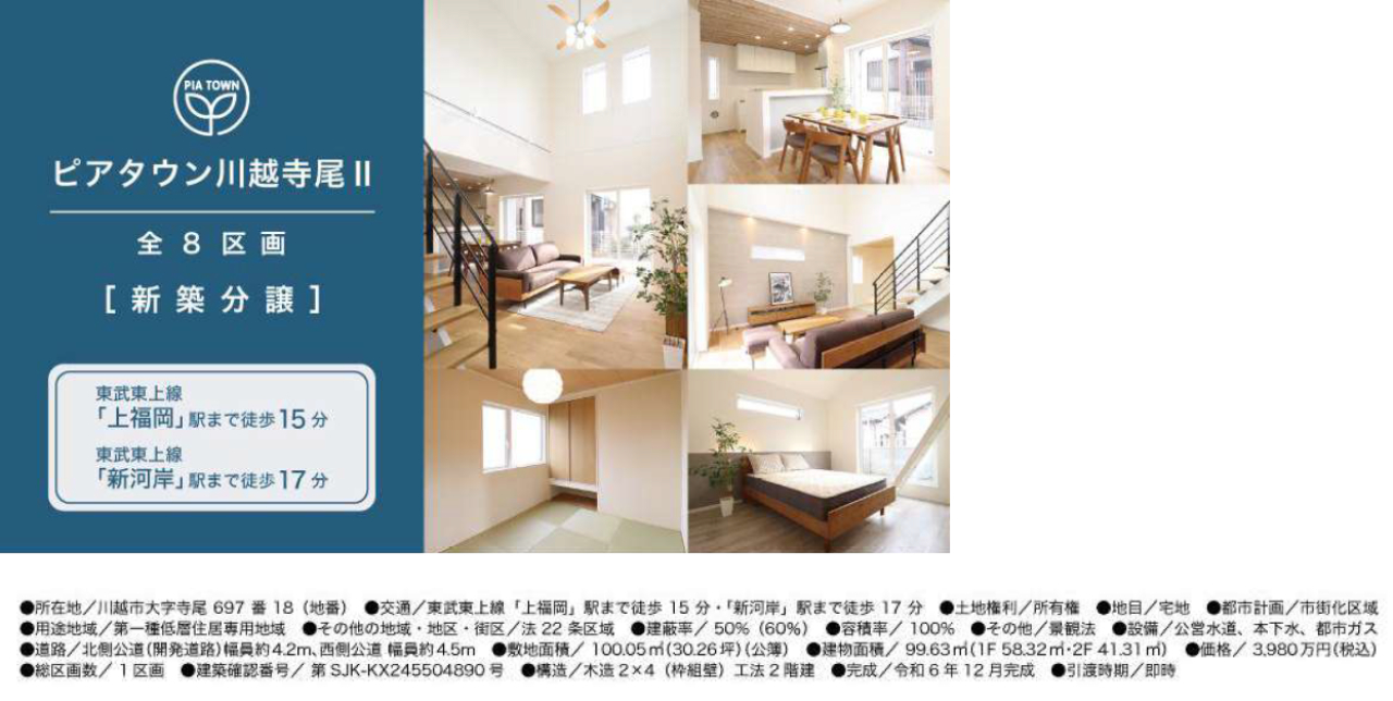 【8号棟】 ☆ピアタウン川越市寺尾Ⅱ 新築一戸建て ★仲介手数料無料新築一戸建て! ☆東武東上線『上福岡駅』徒歩15分、『新河岸駅』徒歩17分! ☆敷地面積30坪! ☆令和6年12月完成済み・未入居! ☆即日引き渡し可能です! ☆北西角地! ☆リビングイン階段や対面キッチン、パントリー付きのリビング! ☆ロフト付き! ☆駐車場1台! ☆川越市立寺尾小学校まで徒歩12分、寺尾中学校まで徒歩9分の通学距離です! ☆公営水道、本下水、都市ガス ☆イオンタウン…徒歩22分、コモディイイダ…徒歩7分、清水町公園…徒歩7分、COCONE…徒歩15分、ローソン…徒歩9分、高階保育園…徒歩7分 |
