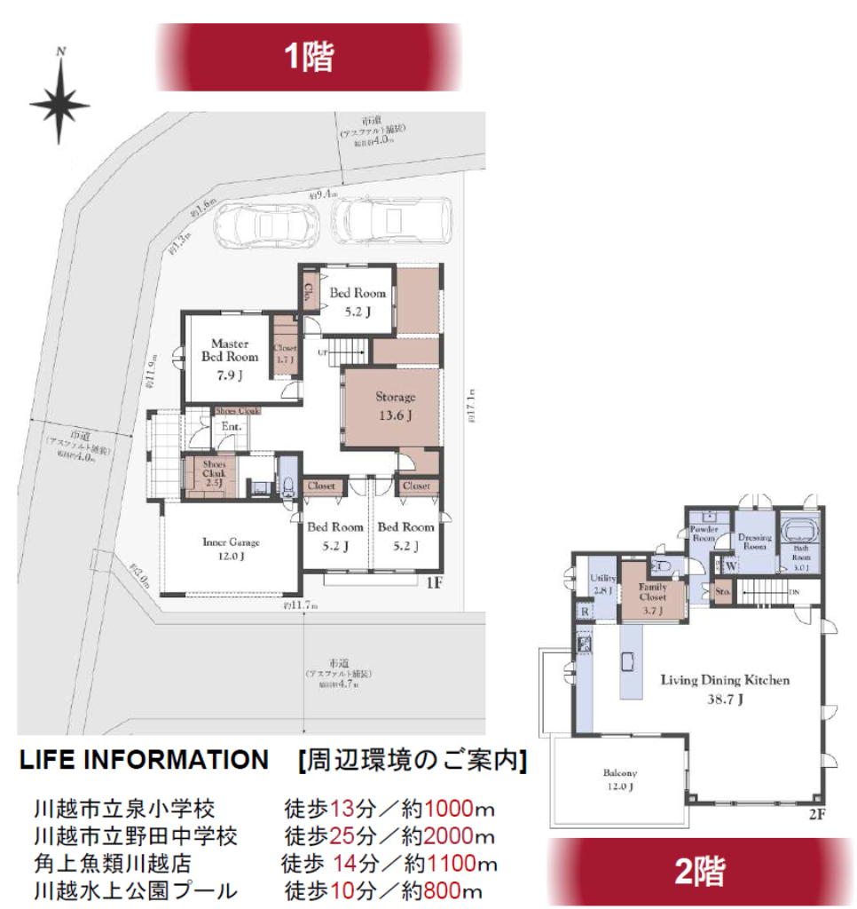 (1F)洋7.9、(1F)洋5.2、(1F)洋10.4、(1F)納戸13.6、(2F)LDK38、(2F)納戸3.7 |