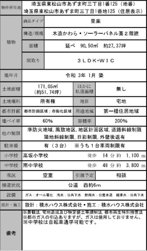 ☆東松山市あずま町3丁目 積水ハウス施工中古戸建て ☆太陽光発電システム(約3.56KW) ☆東武東上線『高坂駅』徒歩11分! ☆敷地面積51坪! ☆令和3年1月完成築浅の中古住宅! ☆大きな勾配吹き抜け! ☆駐車場3台! ☆長期優良住宅! ☆公営水道、本下水、オール電化(都市ガス管あり) ☆アピタ東松山店(約820m)、セブンイレブン高坂駅東口店(約810m)、ドラッグセイムス高坂店(約670m)、高坂郵便局(約600m)、ピオニウォーク東松山(約820m)、カインズ東松山高坂店(約260m)、折本山公園(約650m) |