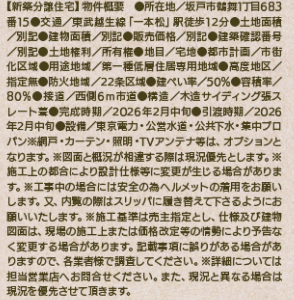 ☆リナージュ坂戸市鶴舞1期 新築一戸建て ★新築仲介手数料0円無料! ☆東武越生線『一本松駅』徒歩12分! ☆長期優良住宅! ☆敷地面積56坪! ☆高断熱・高耐震住宅! ☆対面キッチン付きのリビング19.5帖! ☆キッチンパントリー付き! ☆駐車場2台! ☆坂戸市立浅羽野小学校、浅羽野中学校の通学区です ☆フラット35S利用可! ☆瑕疵担保保険加入物件! ☆断熱等級6取得・耐震等級3取得! ☆公営水道、本下水、集中プロパンガス ※現地販売業者さんは売主ではございません。 アンケート等の手続きをされますと当社での物件紹介(仲介料手数料無料)が出来なくなります。ご内覧を希望のお客様は当社にて立ち合い・ご案内をさせて頂きますのでお手数ですがTEL049-285-6300までお電話下さい。急いで現地へ向かいますので御連絡お待ちしております。 |