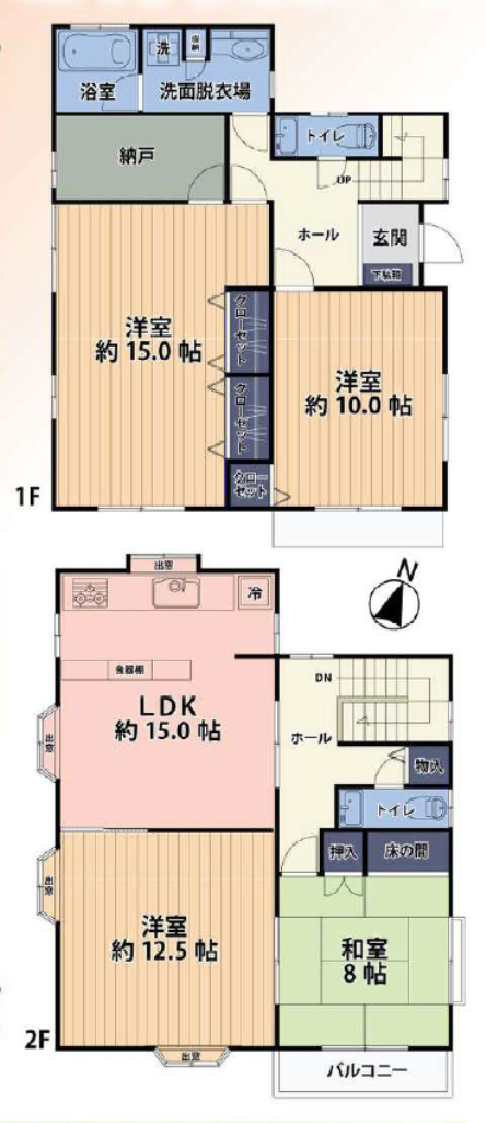 (1F)洋15、(1F)洋10、(1F)納戸、(2F)LDK15、(2F)洋12.5、(2F)和8 |