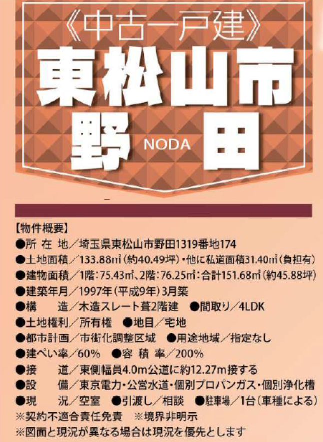 ☆東松山市野田 中古戸建 ☆東武東上線『森林公園駅』徒歩32分、『東松山駅』徒歩32分! ☆敷地面積40坪! ☆平成9年3月築、注文建築の4LDK+納戸! ☆各部屋が広く開放感のある家! ☆人目が気にならない2階のリビングは日差しの入る明るいお部屋です! ☆収納豊富な住まい! ☆室内キレイにお使いです! ☆駐車場1台! ☆東松山市立市ノ川小学校、北中学校の通学区です ☆公営水道、本下水、個別プロパンガス ☆松山幼稚園…徒歩25分、第二仲よし保育園…徒歩18分、マミープラス松山町店…徒歩16分、セブンイレブン東松山市ノ川店…徒歩11分、ファミリーマート東松山松山町店…徒歩18運、柏原内科医院…徒歩6分 |