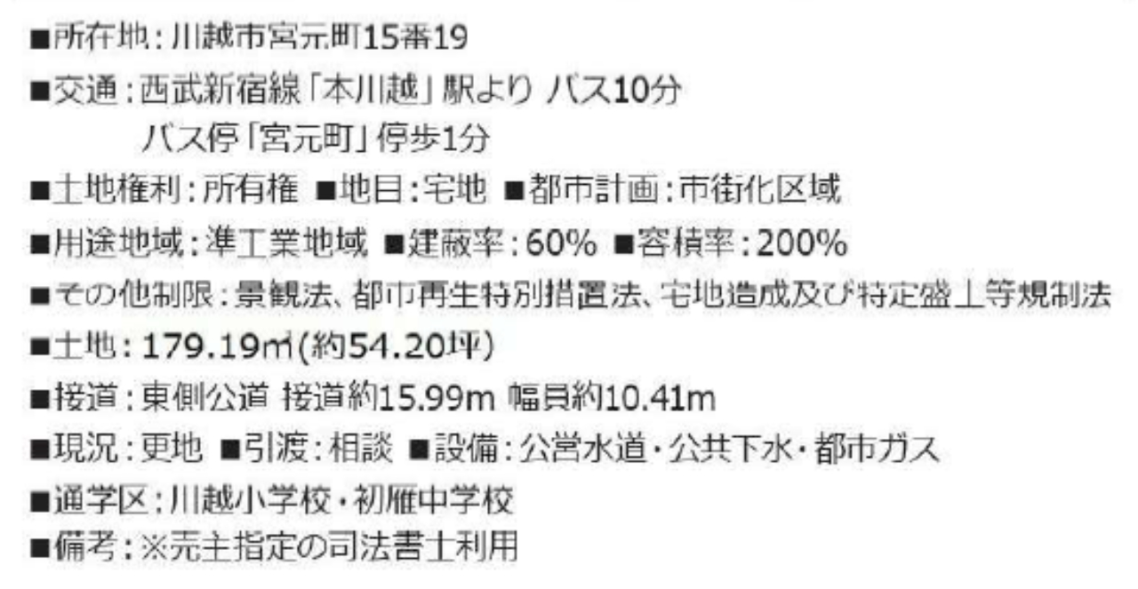 ★仲介手数料無料土地! ☆土地面積54坪! ☆建築条件無し! ☆川越市立川越小学校、初雁中学校の通学区 ☆公営水道、公共本下水、都市ガス ☆どなたでも建築できる土地です!(34条11号適用含む) |