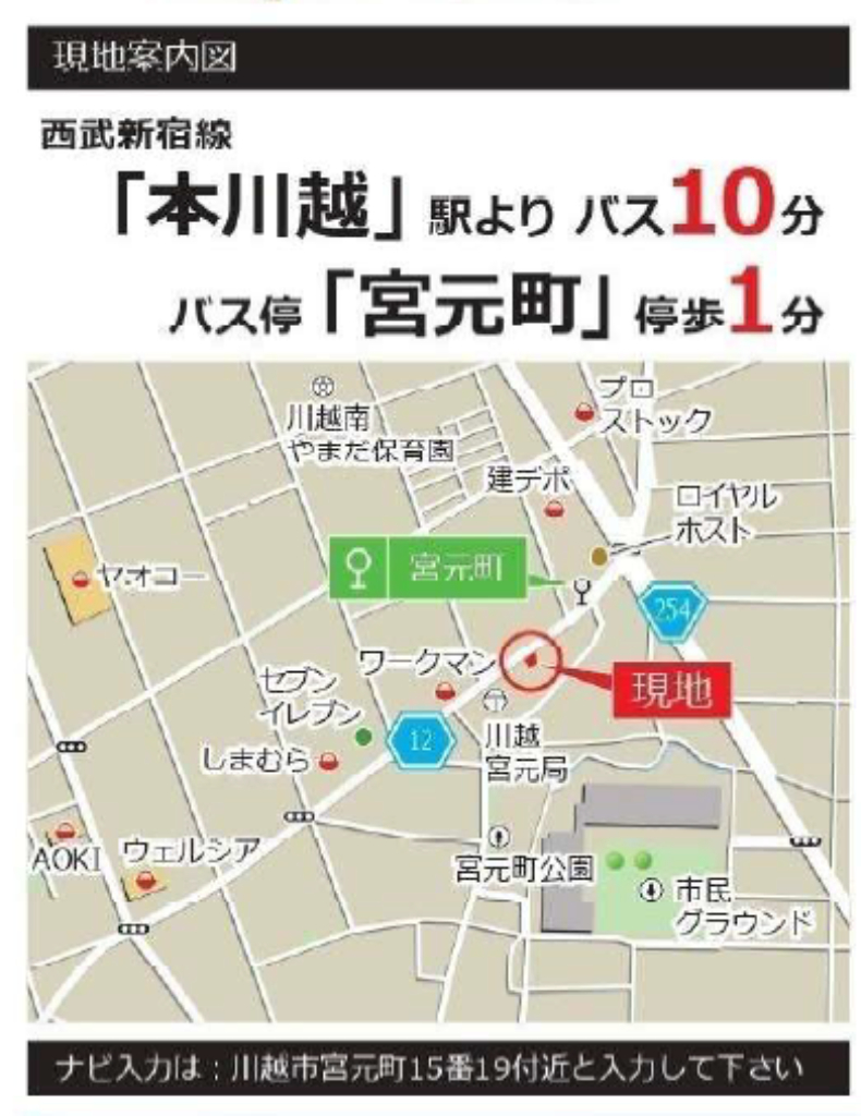 ☆川越市宮元町 建築条件無し売地! ★仲介手数料無料土地! ☆西武新宿線『本川越駅』バス10分、バス停『宮元町』停歩1分! ☆土地面積54坪! ☆建築条件はありません。お好きなハウスメーカーで建築できます! ☆前面道路10m以上! ☆川越市立川越小学校、初雁中学校の通学区です ☆公営水道、公共本下水、都市ガス ☆どなたでも建築できる土地です!(34条11号適用含む) ☆ヤオコー…徒歩10分、マミーマート…徒歩10分、セブンイレブン…徒歩2分、ウエルシア…徒歩6分、ユニクロ…徒歩6分 |