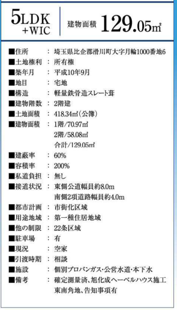 ☆比企郡滑川町月輪 中古戸建 ☆東武東上線『武蔵嵐山駅』徒歩3分! ☆敷地面積126坪! ☆平成10年9月築、旭化成ヘーベルハウス施工の5LDK中古住宅! ☆駅まで徒歩3分の好立地! ☆令和7年3月リフォーム完了!(ユニットバス交換、浴室換気乾燥暖房機付き、洗面台交換、トイレ交換、畳表替え、クロス張替、フロアタイル貼替、網戸全室交換、モニター本交換、玄関扉・玄関収納交換、ハウスクリーニングなど) ☆広い敷地でカースペース多数! ☆南×東道路に面した角地で陽当たり良好! ☆滑川町立月の輪小学校、滑川中学校の通学区です ☆公営水道、本下水、個別プロパンガス |