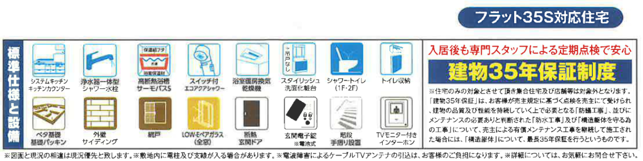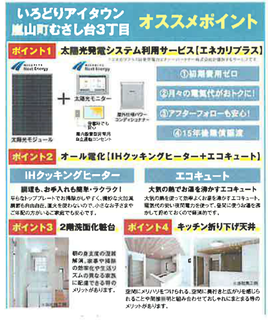 【1号棟】 ☆比企郡嵐山町むさし台3丁目 新築一戸建て 全2棟現場 ★新築仲介手数料無料! ☆東武東上線『武蔵嵐山駅』徒歩8分! ☆敷地面積55坪! ☆全室南向きで明るい家! ☆家事動線の良い対面キッチン付きのリビングと全室6帖のゆとりのあるお部屋! ☆システムキッチン、浄水器一体型シャワー水栓、浴室暖房乾燥機、洗面化粧台、シャワートイレ、網戸、ペアガラス、玄関断熱ドア、玄関電子錠、TVモニター付きインターホン、IHクッキングヒーターなどの設備です! ☆太陽光発電システムやオール電化でエコな住宅! ☆駐車場3台! ☆嵐山町立志賀小学校、玉ノ岡中学校の通学区です ☆瑕疵担保保険加入物件! ☆住宅性能評価書取得予定物件! ☆フラット35S利用可! ☆公営水道、本下水、オール電化 ☆若草保育園(約1080m)、嵐山幼稚園(約3640m)、ヤオコー嵐山バイパス店(約1330m)、カインズモール嵐山店(約2300m)、セブンイレブン(約270m)、武蔵嵐山病院(約2680m)、西大寺病院(約480m) ※現地販売業者さんは売主ではございません。 アンケート等の手続きをされますと当社での物件紹介(仲介料手数料無料)が出来なくなります。ご内覧を希望のお客様は当社にて立ち合い・ご案内をさせて頂きますのでお手数ですがTEL049-285-6300までお電話下さい。急いで現地へ向かいますので御連絡お待ちしております。 |