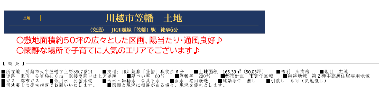 ☆敷地面積50坪! ☆建築条件無し! ☆陽当たり良好! ☆川越市立霞ヶ関西小学校まで徒歩3分、霞ヶ関西中学校まで徒歩7分! ☆公営水道、公共本下水、都市ガス ☆どなたでも建築できる土地です!(34条11号適用含む) |